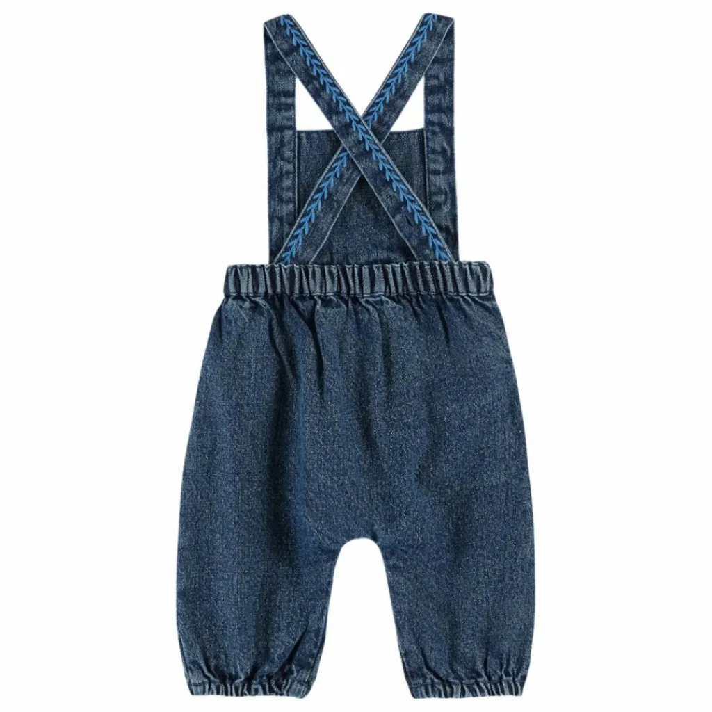 - Salopette bébé en coton denim bleu brodée de guirlandes de feuilles bleues sur la ceinture et tout le long des bretelles qui encadrent la bavettes et une rose bleue, brodée au point de croix, égaie le centre de celle-ci.