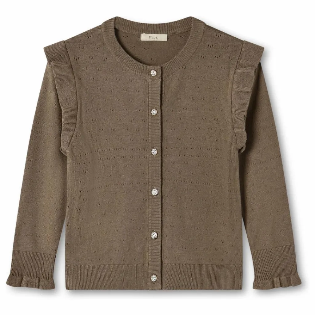 - Cardigan tricoté en pointelle, d’une qualité douce et légère. Le cardigan a des manches longues avec des volants, une encolure ovale en tricot côtelé et des volants aux épaules. Le cardigan est fermé par les boutons dorés les plus fins, chacun avec une pierre au centre.