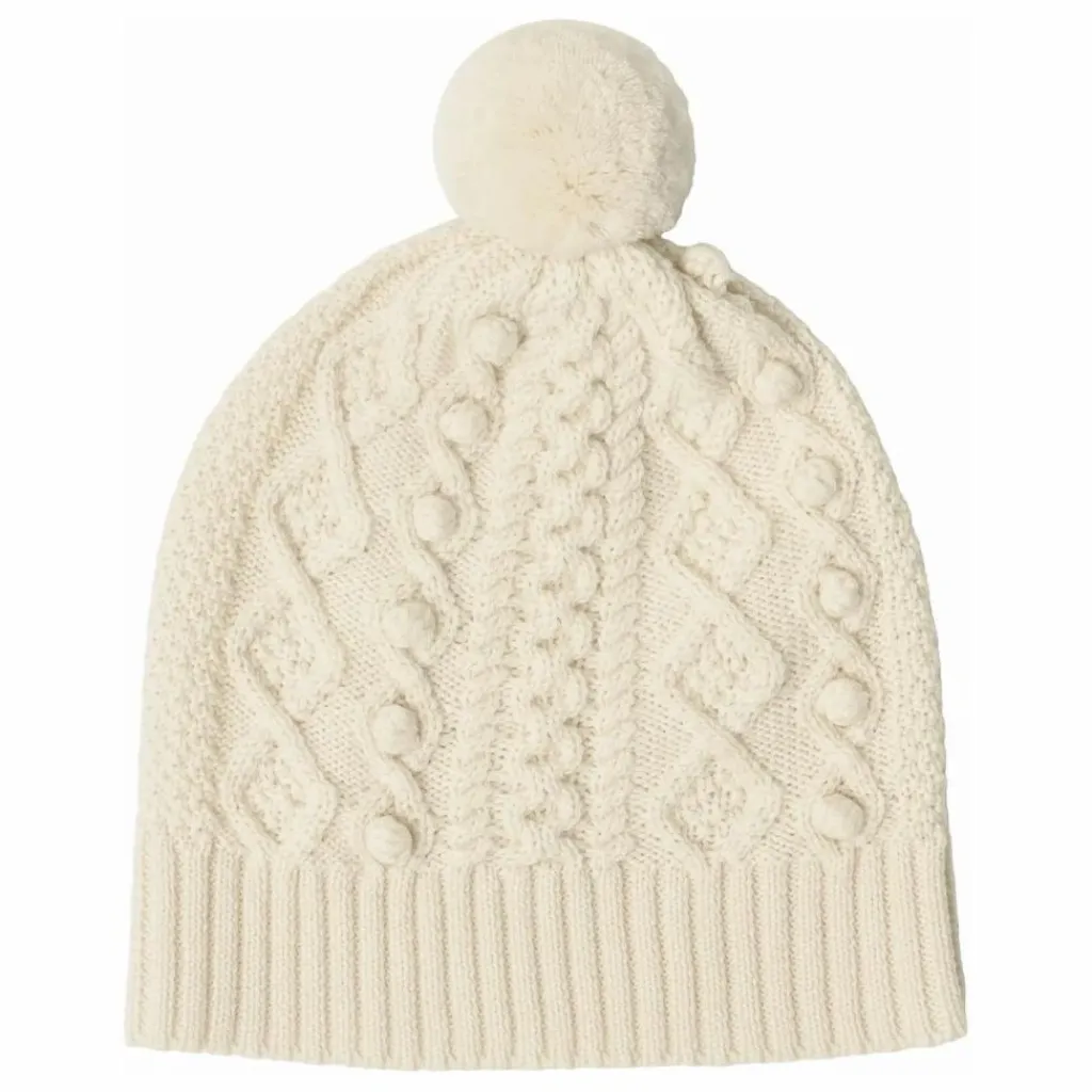 - Ce bonnet est fabriqué en laine mérinos douce et tricoté dans un motif graphique d’Aran. Il est doté d’un bord côte confortable et d’un pompon au sommet, parfait pour les journées froides. Notre laine mérinos est certifiée BLUESIGN® et RWS, exempte de produits chimiques nocifs, et provient de moutons non mulets.