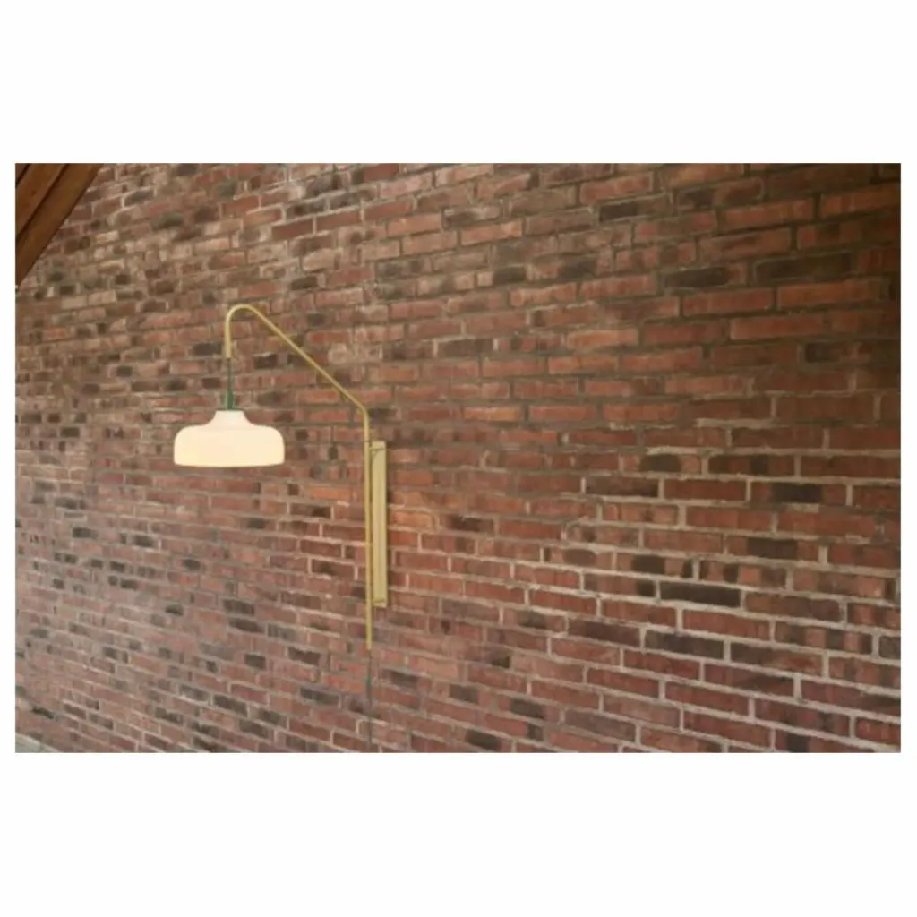 - Grande applique murale en métal de couleur kaki avec un cordon en tissu vert sombre et un abat-jour en verre opale légèrement arrondi.