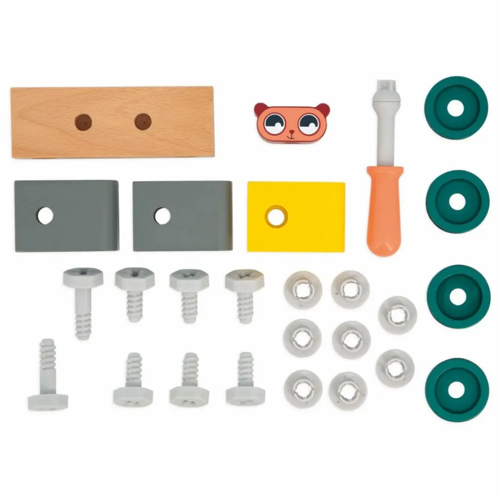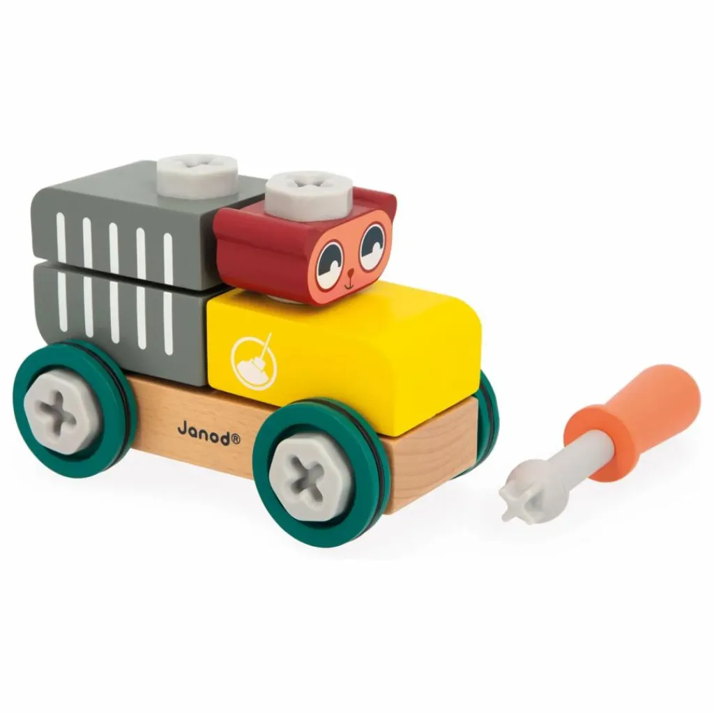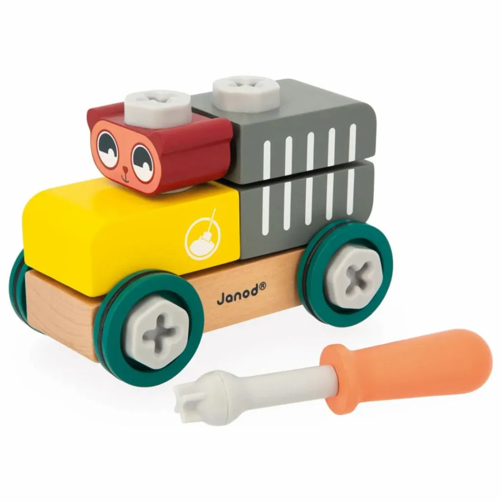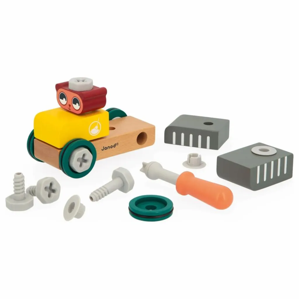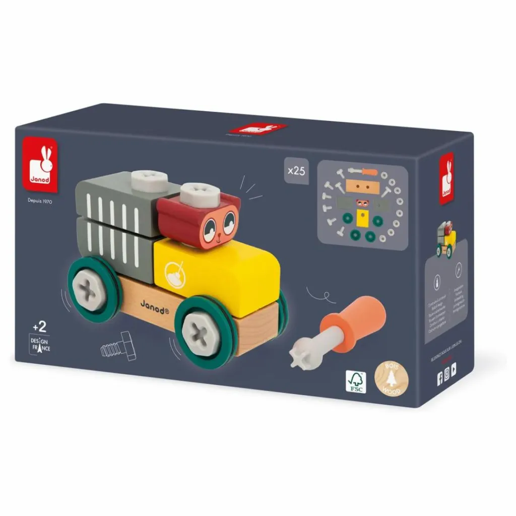 Cette voiture en bois à construire, destinée aux enfants dès 3 ans, permet de développer leur imagination et leur motricité fine tout en s’amusant. Composée de 9 pièces en bois et de 16 éléments de visserie en plastique, le kit inclut également un tournevis et une carte modèle pour guider les petits bricoleurs. Une fois assemblée, la voiture jaune et grise est prête à rouler, emportant le petit ours pour des aventures passionnantes. Fabriqué en bois certifié FSC™, ce jouet fait partie de la collection Brico’Kids, idéal pour imiter les grands tout en s’amusant.