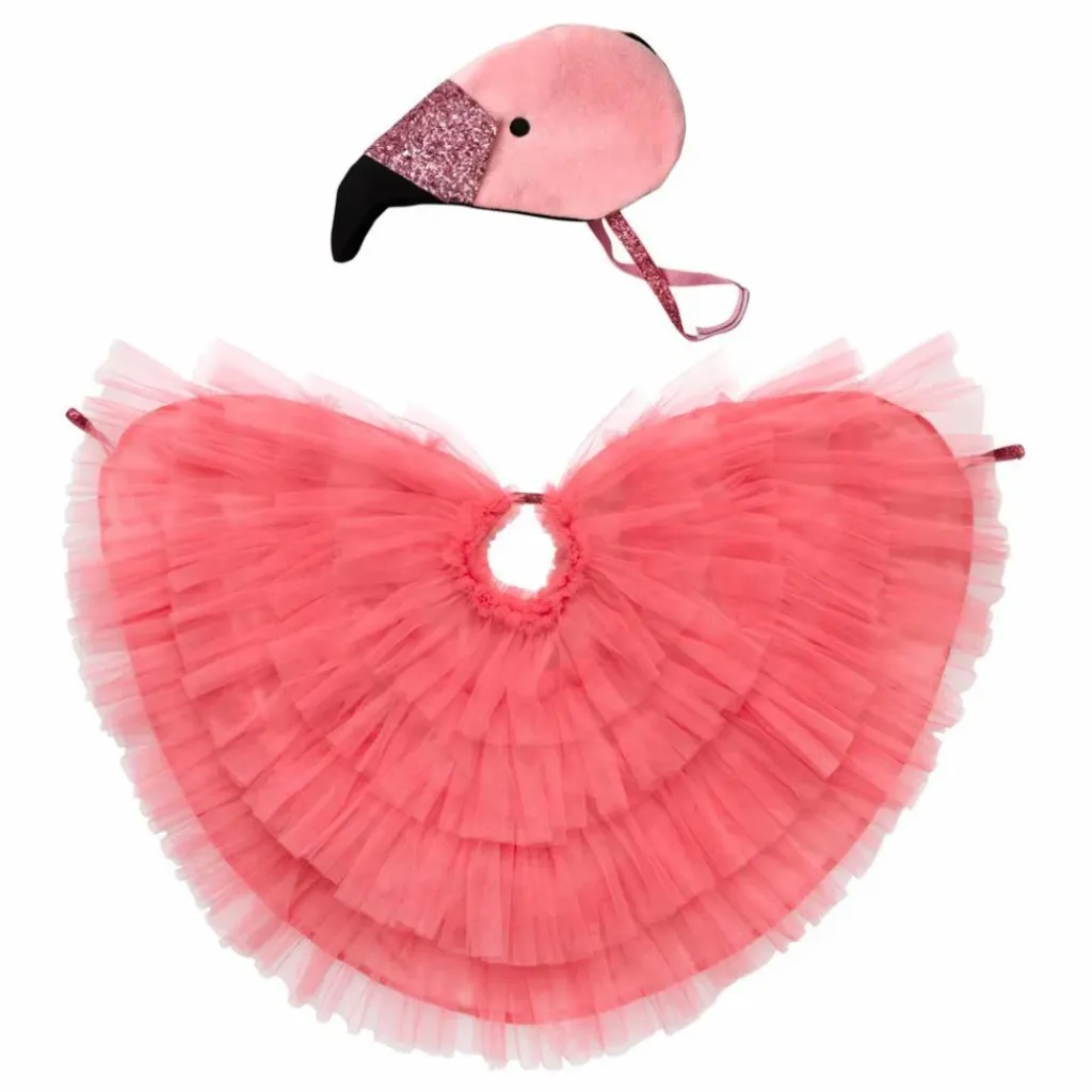 Laissez-les jouer leurs plus belles histoires en se parant de cet incroyable costume de flamant rose. Les ailes sont faites de volants de tulle rose, finies par de jolis bracelets pailletés et la tête du flamant, conçue en velours et parée de jolies broderies, se porte telle une coiffe.