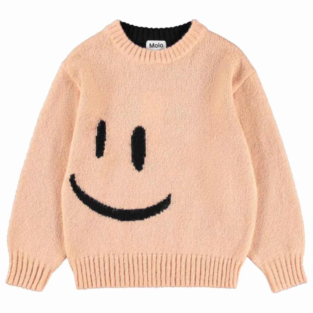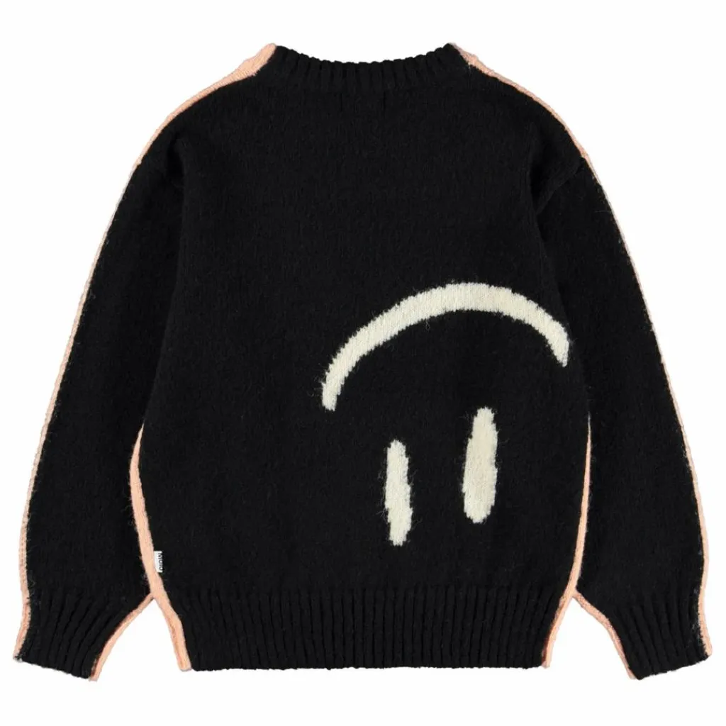 - Ce pull rose et noir en laine mélangée d’alpaga de Molo a une encolure ronde avec des bords côtelés, ainsi que des poignets et une taille côtelés. Le pull a une coupe ample et peut être porté avec le devant ou le dos comme devant. Le devant et le dos sont ornés de grands visages souriants.
