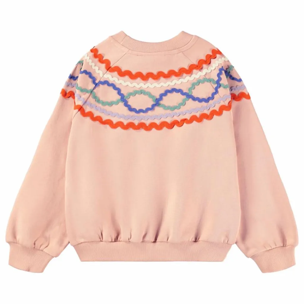 - Ce sweat-shirt rose de Molo est en coton biologique et présente un motif coloré de rubans cousus. Il a un col rond, des manches raglan et des bords côtelés aux poignets et à l’ourlet.