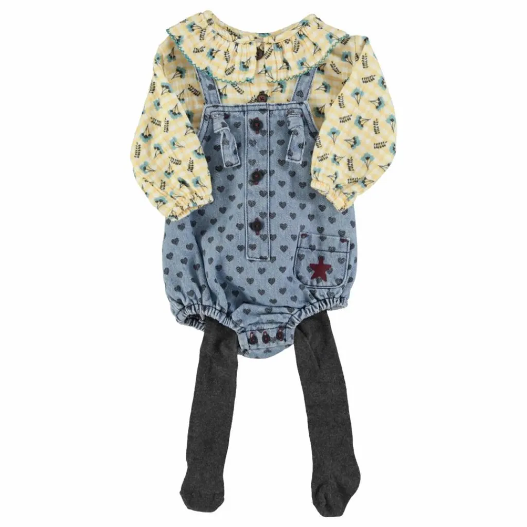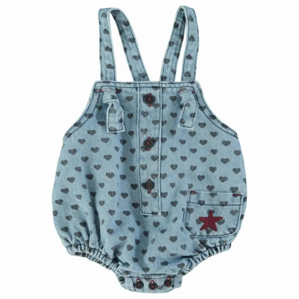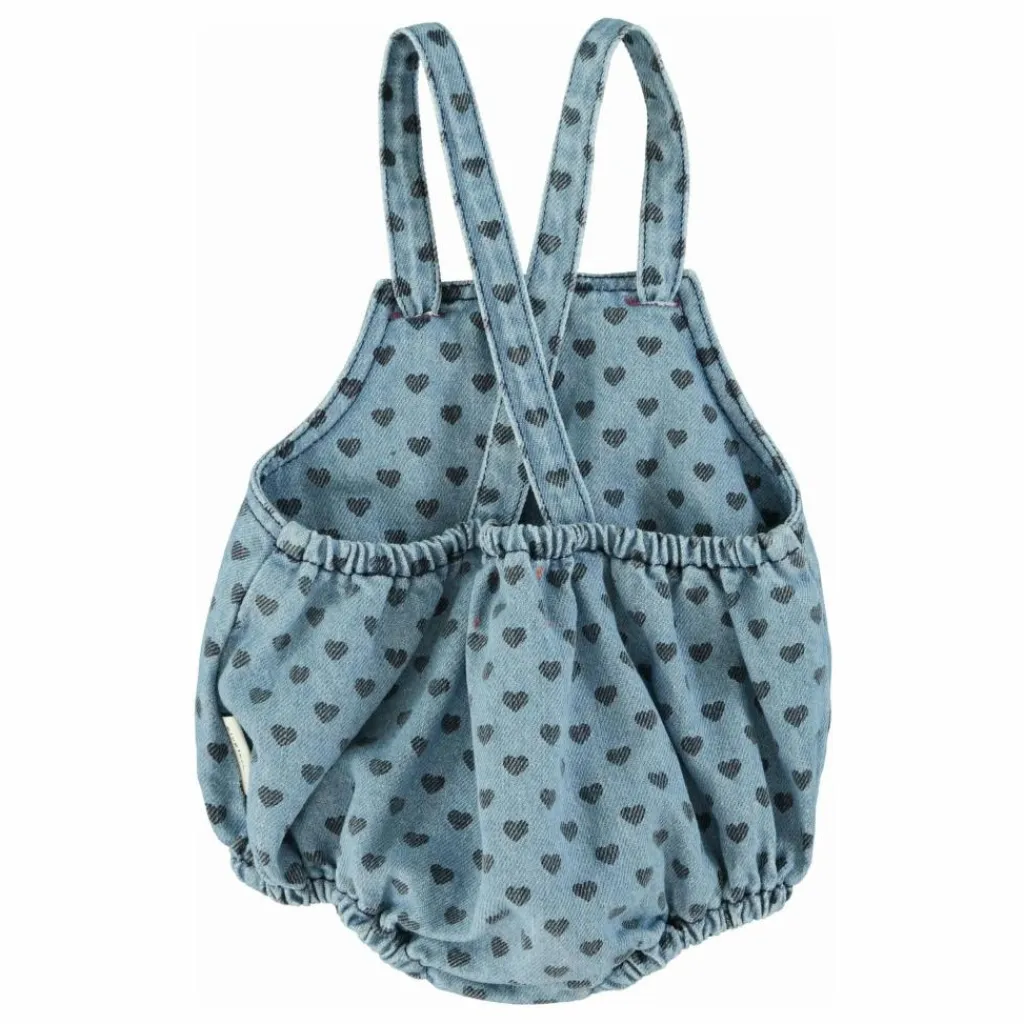 - Grenouillère pour bébé en denim doux avec fines bretelles réglables. Petite poche avec logo brodé bordeaux. Boutons entre les jambes.