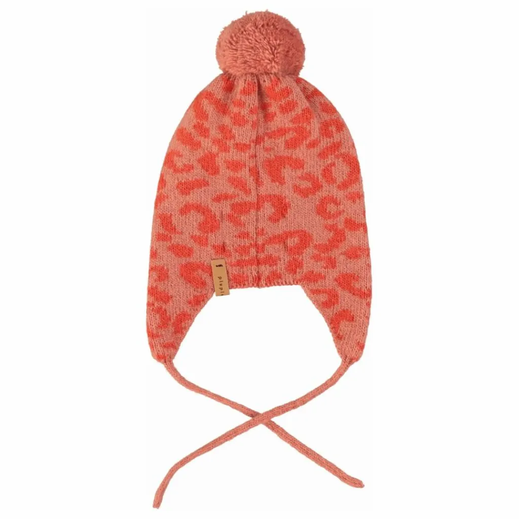 - Bonnet tricoté pour bébé avec pompon, rabats d’oreilles et étiquette logo en cuir.
