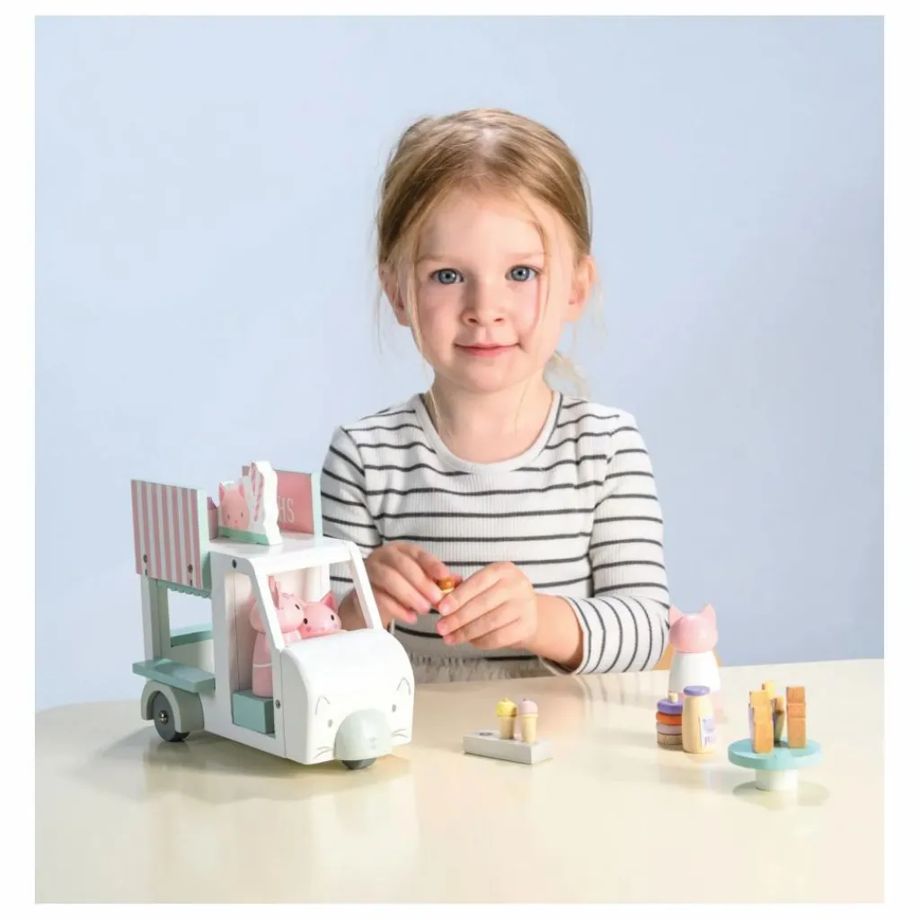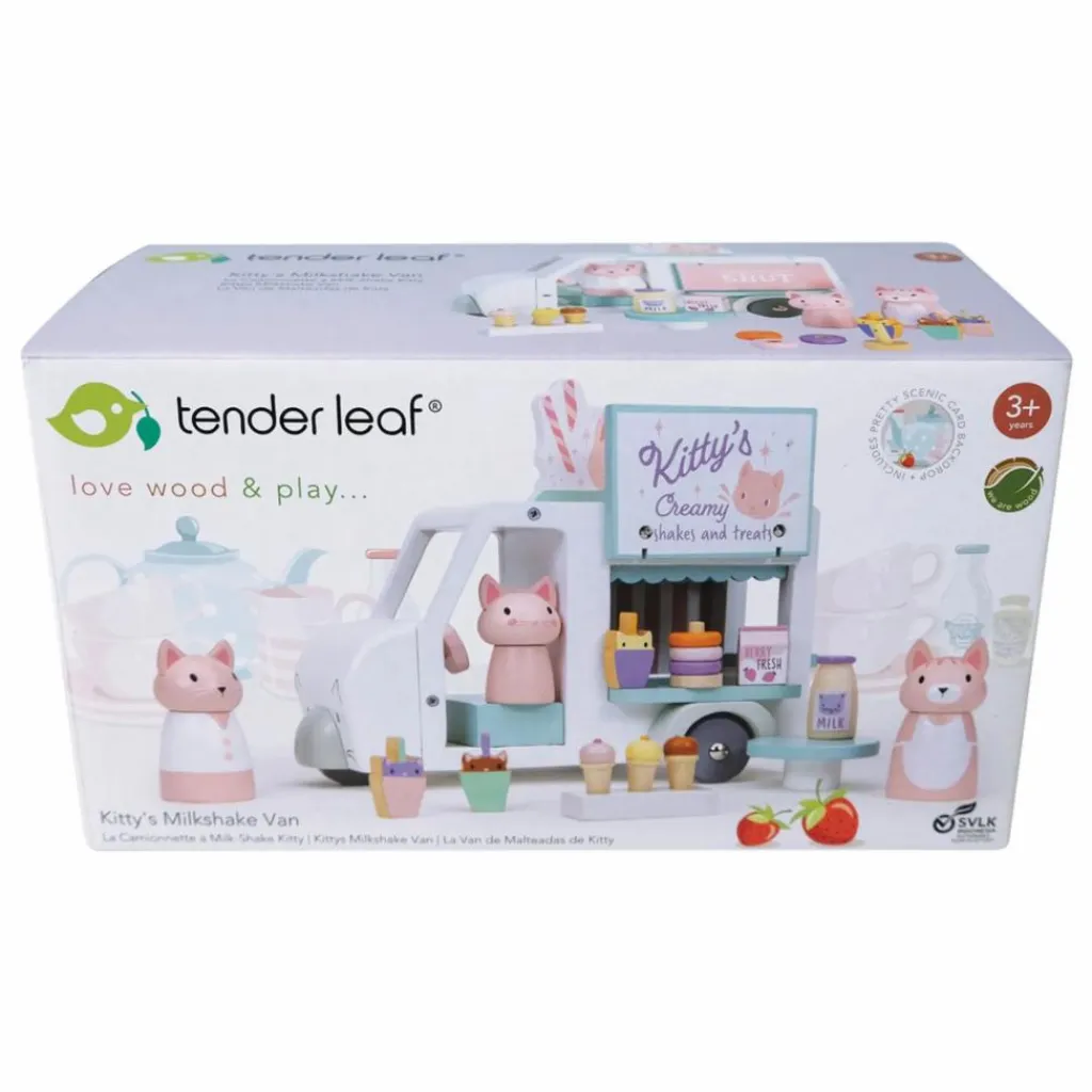 Voici Kitty et sa famille qui travaille dur ! Ils parcourent la ville et servent de délicieux milkshakes, beignets et glaces par les trappes situées sur les trois côtés de leur camionnette blanche à trois roues. Une toile de fond pliable complète la scène et permet de raconter d’autres histoires. Idéal pour les jeux d’imagination. Idéal pour raconter des histoires.