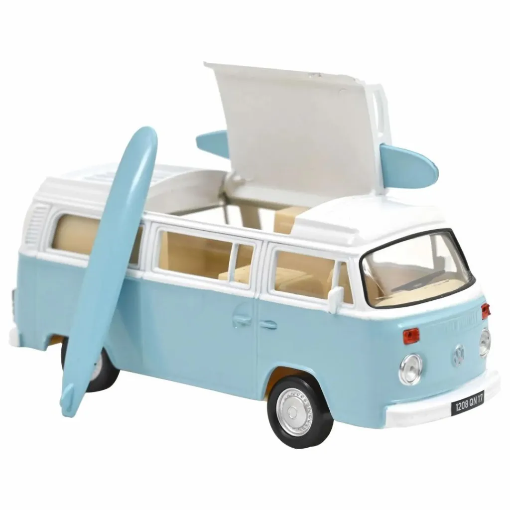- Le mythique Combi Volkswagen T2B se décline ici dans une adorable version bleu pastel au 1/43, spécialement pensée pour des heures de jeu créatif. Véritable icône vintage, ce van inspire autant les voyages en famille que les sorties improvisées entre amis imaginaires.