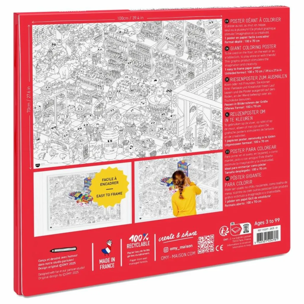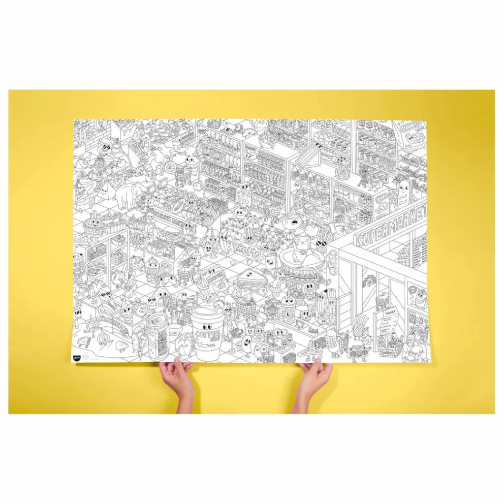 Plonge dans un supermarché pas comme les autres, rempli de scènes pleines d’humour, de détails rigolos et de produits déjantés à colorier sans modération. Chaque recoin du poster regorge de surprises à découvrir, seul ou à plusieurs !