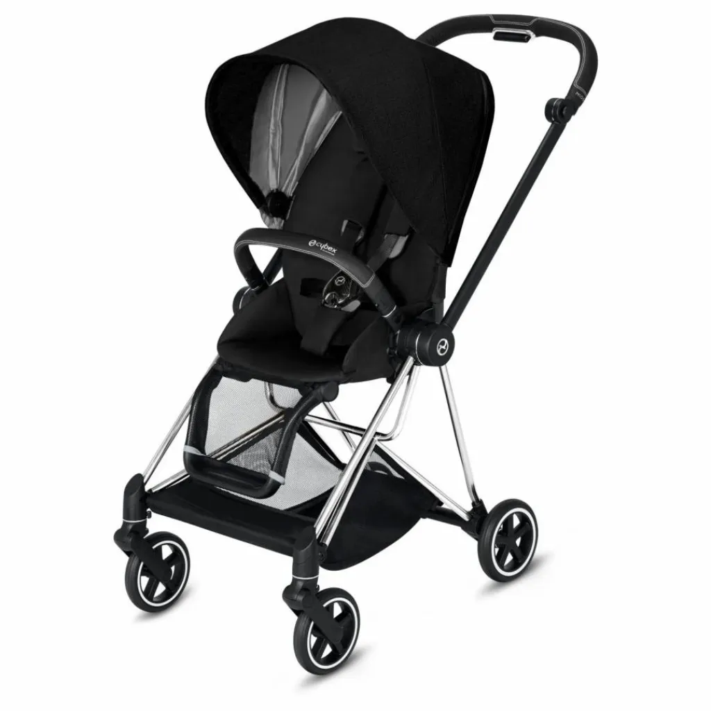 Habillage siège Mios : Dossier en filet, Harnais à une sangle, Inclinaison et pliage d’une main, Suspension intégrale, Siège réversible, Canopy pare-soleil XXL, Repose-jambes réglable.