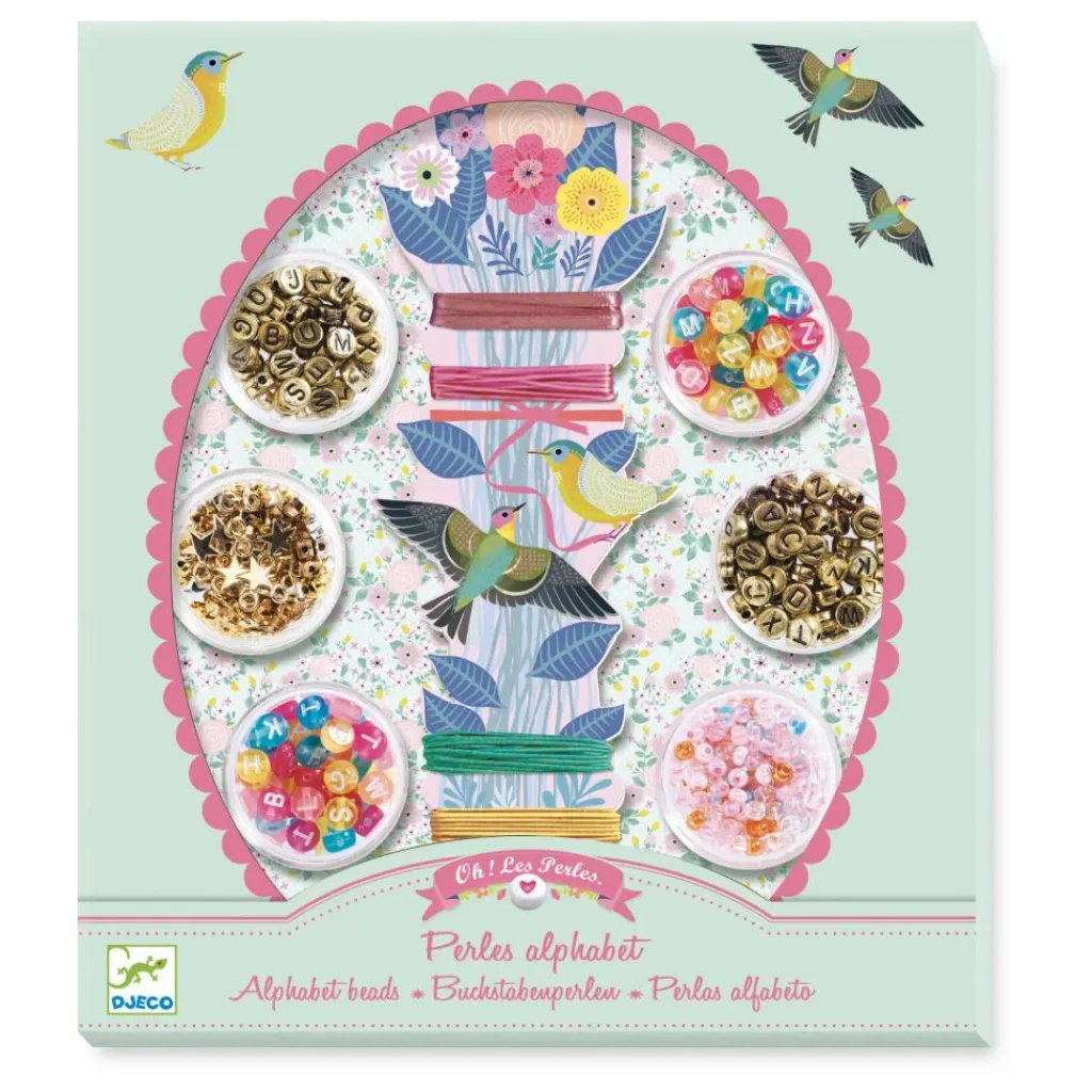 - 6 boîtes de perles colorées et dorées (4 de perles alphabet, 1 de perles dorées, 1 de perles colorées), 1 bobine avec 4 fils élastiques colorés