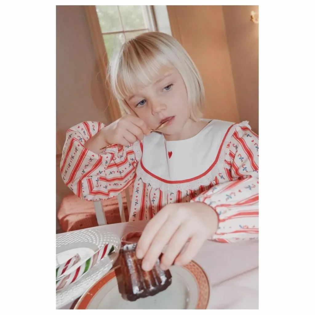 - La blouse Noelle est en coton doux avec un adorable imprimé inspiré de Noël. La robe présente un col rond et des manches raglan avec un ourlet élastique. L’empiècement blanc est orné d’un joli volant en dentelle, d’une bordure contrastée rouge et d’une broderie en forme de cœur. La robe se ferme dans le dos par des boutons en nacre.