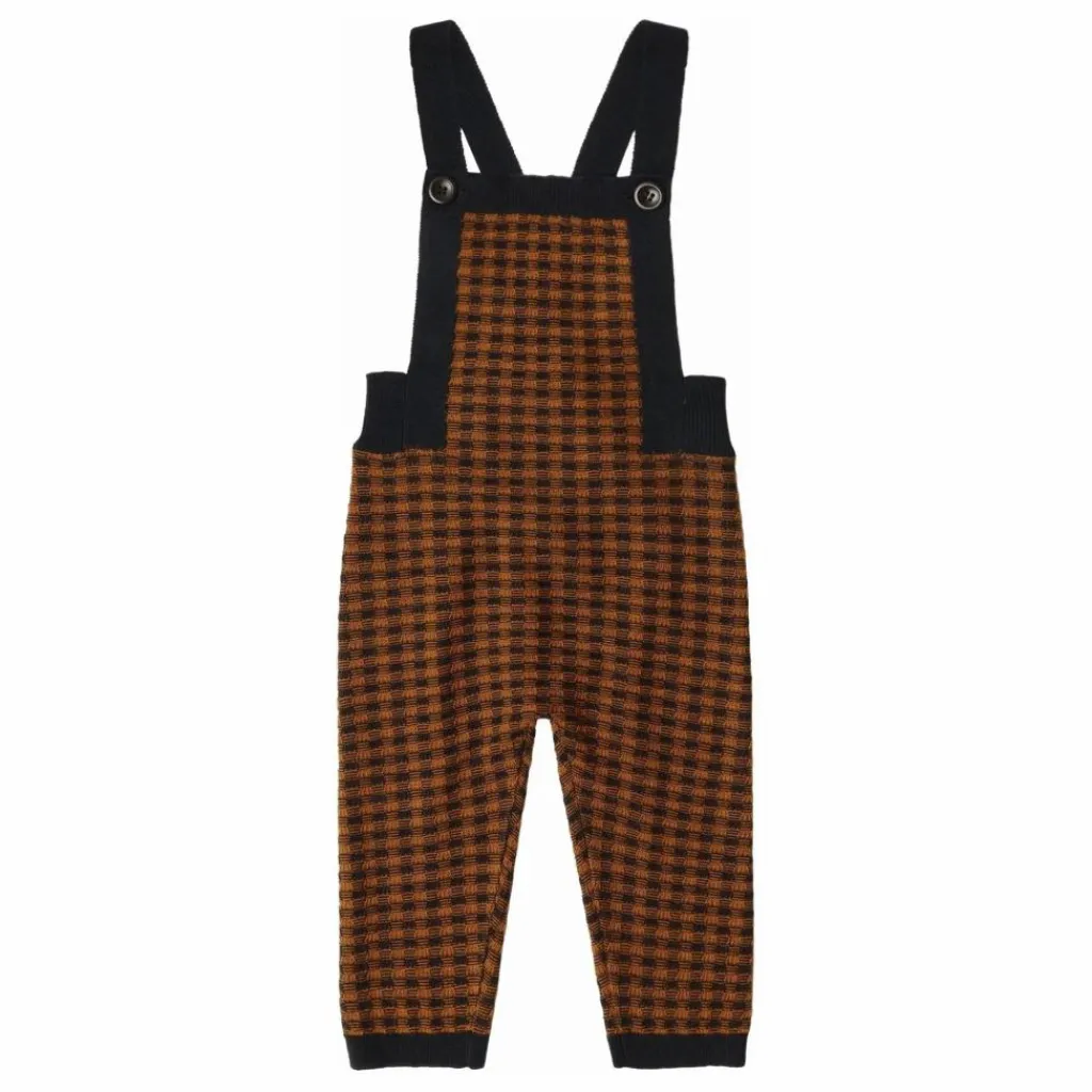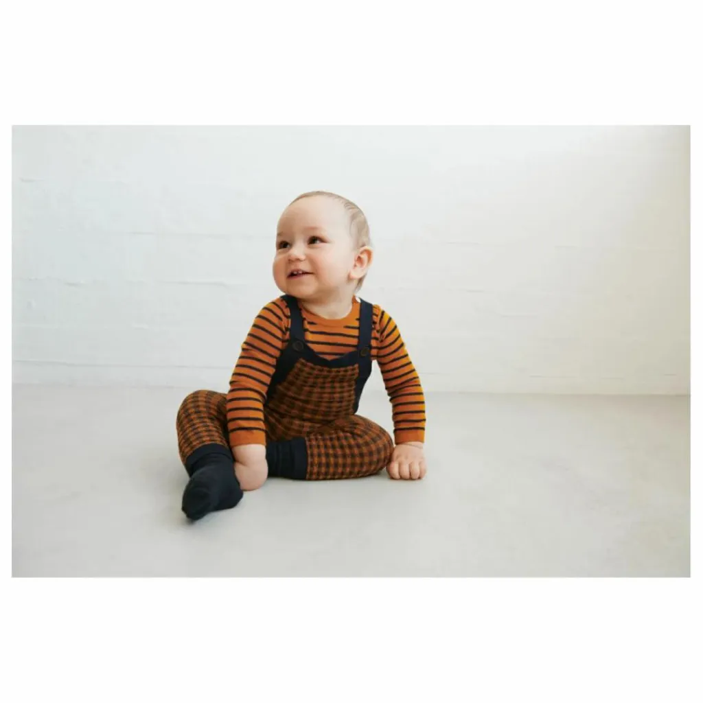 - Cette salopette pour bébé est fabriquée en pure laine mérinos et comporte des bretelles amovibles, un empiècement côtelé sur le dessus et une fermeture boutonnée sur le devant avec des boutons en nacre. Les bretelles se croisent dans le dos et peuvent être réglées en deux longueurs. La laine est certifiée BLUESIGN® et RWS, exempte de produits chimiques nocifs, et provient de moutons non mulets.