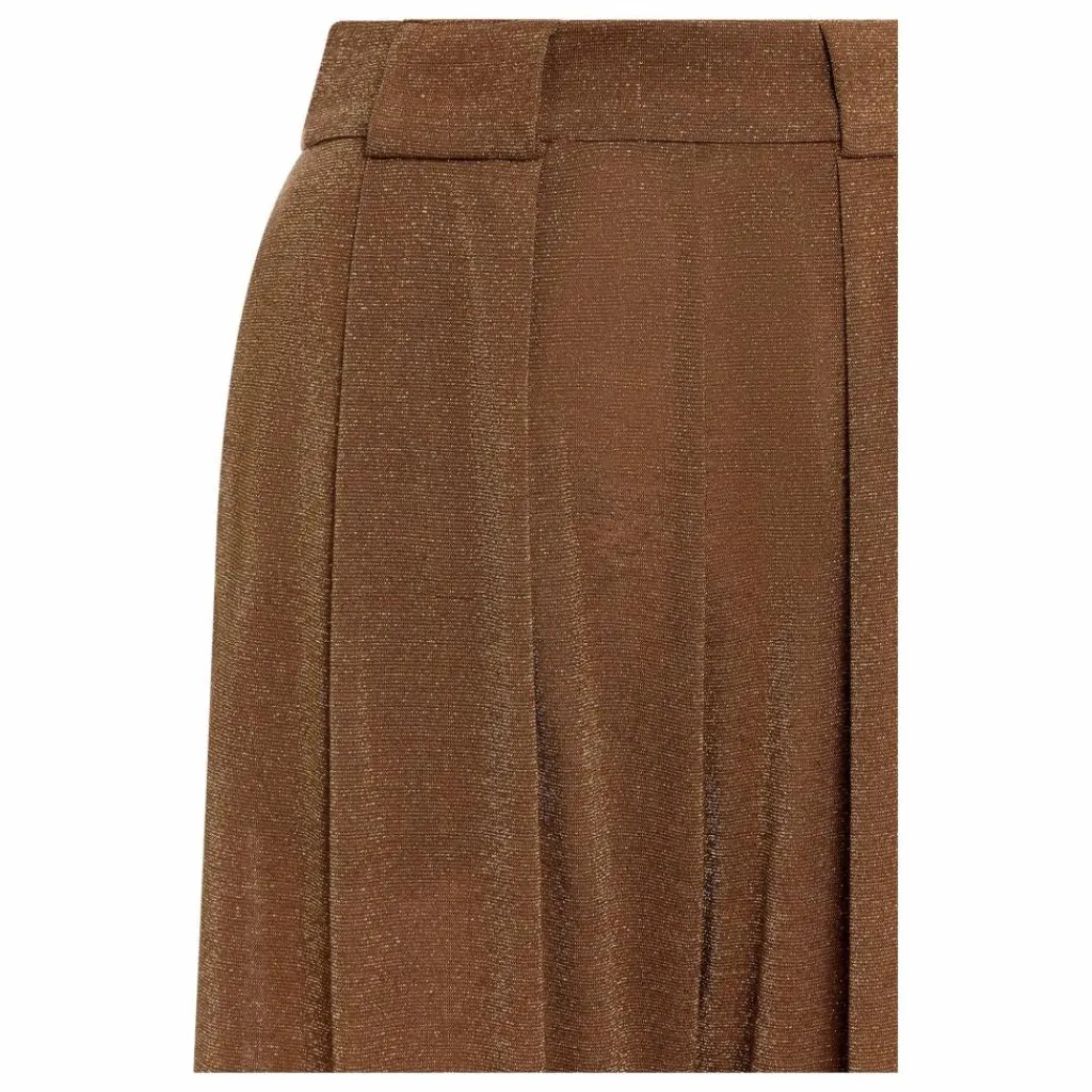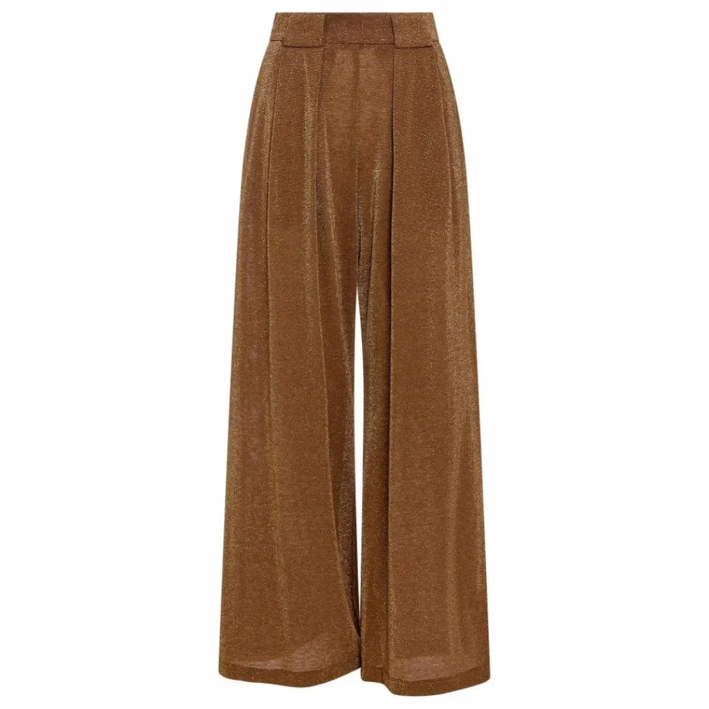 - Pantalon carry-over en jersey stretch lurex, à la ligne ample et aérée, avec plis frontaux bloqués par des maxi passants, poches insérées sur le côté et ceinture élastique à l’arrière.