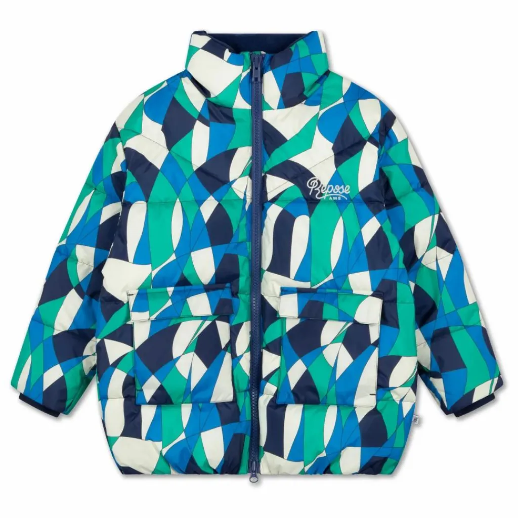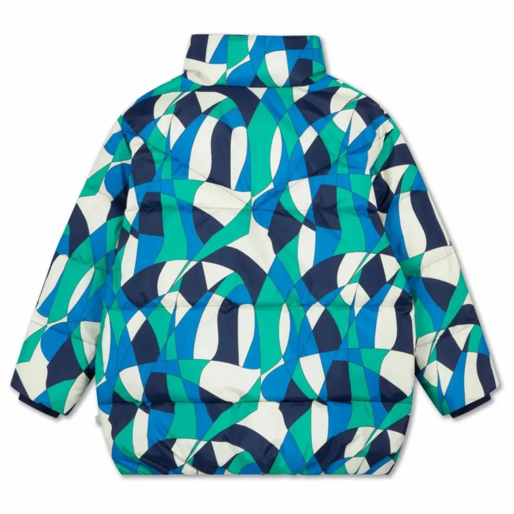 - Manteau bouffant – kaléidoscope Ce manteau bouffant, qui a déjà fait ses preuves, se décline cette fois dans un motif kaléidoscope audacieux à l’allure rétro. Entièrement doublé et rembourré, il protège du froid tout en donnant un air amusant aux journées d’hiver. Fermeture à glissière, poches, polaire douce au col – il est conçu pour être utile et portable au quotidien par temps hivernal. Le tissu est traité sans produits chimiques agressifs. Matériaux : 100% polyester recyclé