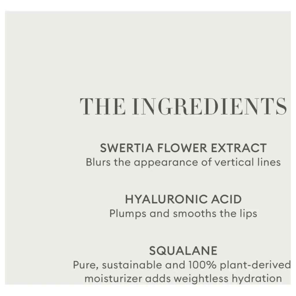 - EXTRAIT DE FLEUR DE SWERTIA, estompe visiblement l’apparence des lignes verticales des lèvres ; MOUTARDE ORANGANIQUE, donne aux lèvres un aspect ferme et pulpeux ; SQUALANE, apporte une hydratation sans poids.