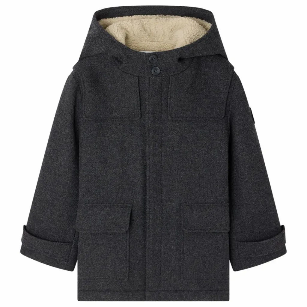 - Le duffle-coat Julien pour garçon redouble de sophistication avec son drap de laine et sa doublure en sherpa. Il se ferme devant par un zip et des boutons au col. En drap de laineCapucheDeux poches à rabat
