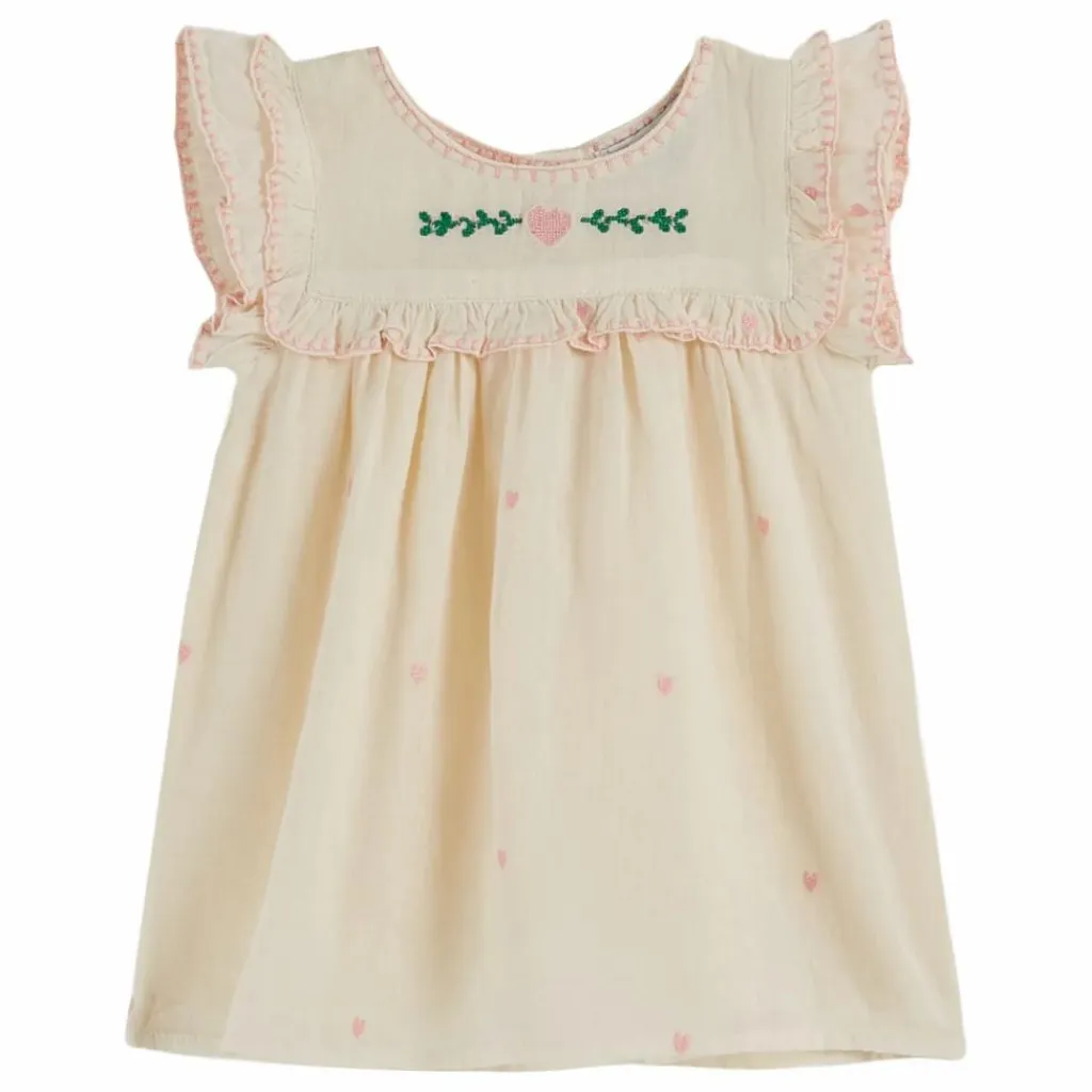 - Robe bébé en fine gaze de coton écru, ornée de mini cœurs rose pâle en all-over. Au centre de l’empiècement avant, entre deux guirlandes de feuilles vertes, un plus gros cœur est brodé au point de croix. Comment rester insensible aux broderies, reprenant la couleur des cœurs, qui embellissent l’encolure ras-du-cou, les froufrous encadrant les empiècements et les volants des entournures ? Une couleur et des broderies qui apportent douceur à tous les cœurs.