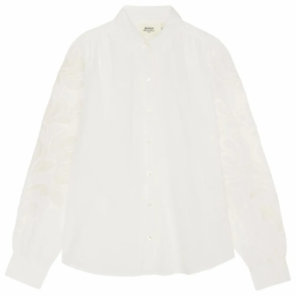 - Chemise fille en voile de coton avec broderies aux manches. Col chemise et patte de boutonnage visible. Manches amples à poignets simples et plis d’aisance dans le dos. Boutons en nacre.
