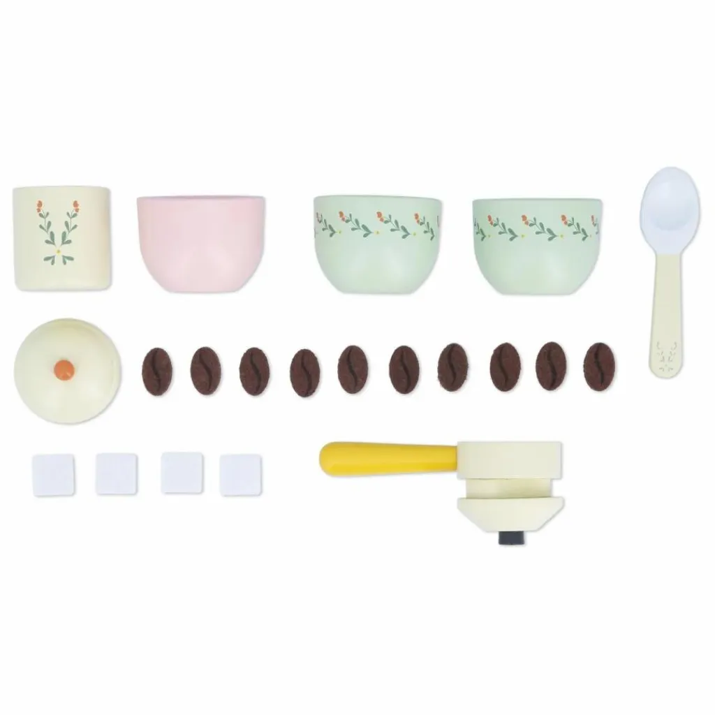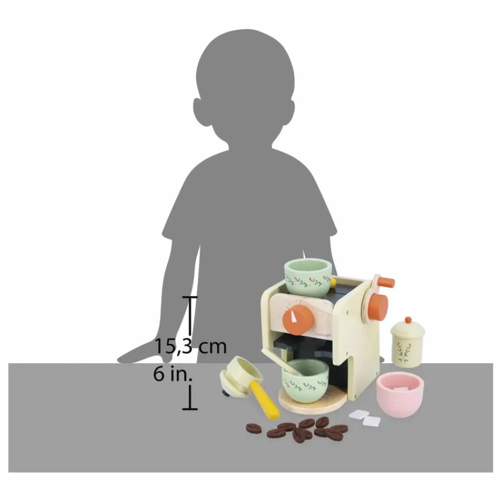 - Envie de devenir un véritable barista ? Cette machine à café aux nombreuses fonctionnalités est idéale pour faire couler et déguster de bons cafés bien chauds comme papa et maman. Sur la machine à café il y a une trappe sur le dessus pour glisser les grains de café à moudre. Cric – cric – cric, tournez la manivelle sur le côté et magie! Récupérez le marc de café dans le petit tiroir à l’arrière de la machine ! Les mettre dans la poignée porte-filtre, l’insérer dans la machine et la tourner d’un quart de tour pour la bloquer. Plus qu’à régler la taille du café ou sa température avec le bouton rotatif et sonore sur le devant. Le café est prêt ! Et si besoin, il est possible d’ajouter un sucre. Jouet d’imitation en bois FSCTM. Jouet pour les enfants à partir de 3 ans.