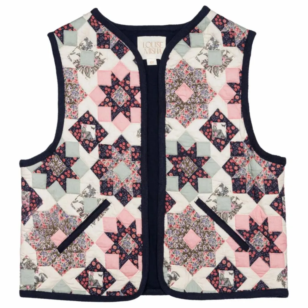 - Veste sans manches réversible avec un côté façon patchwork et un côté uni.