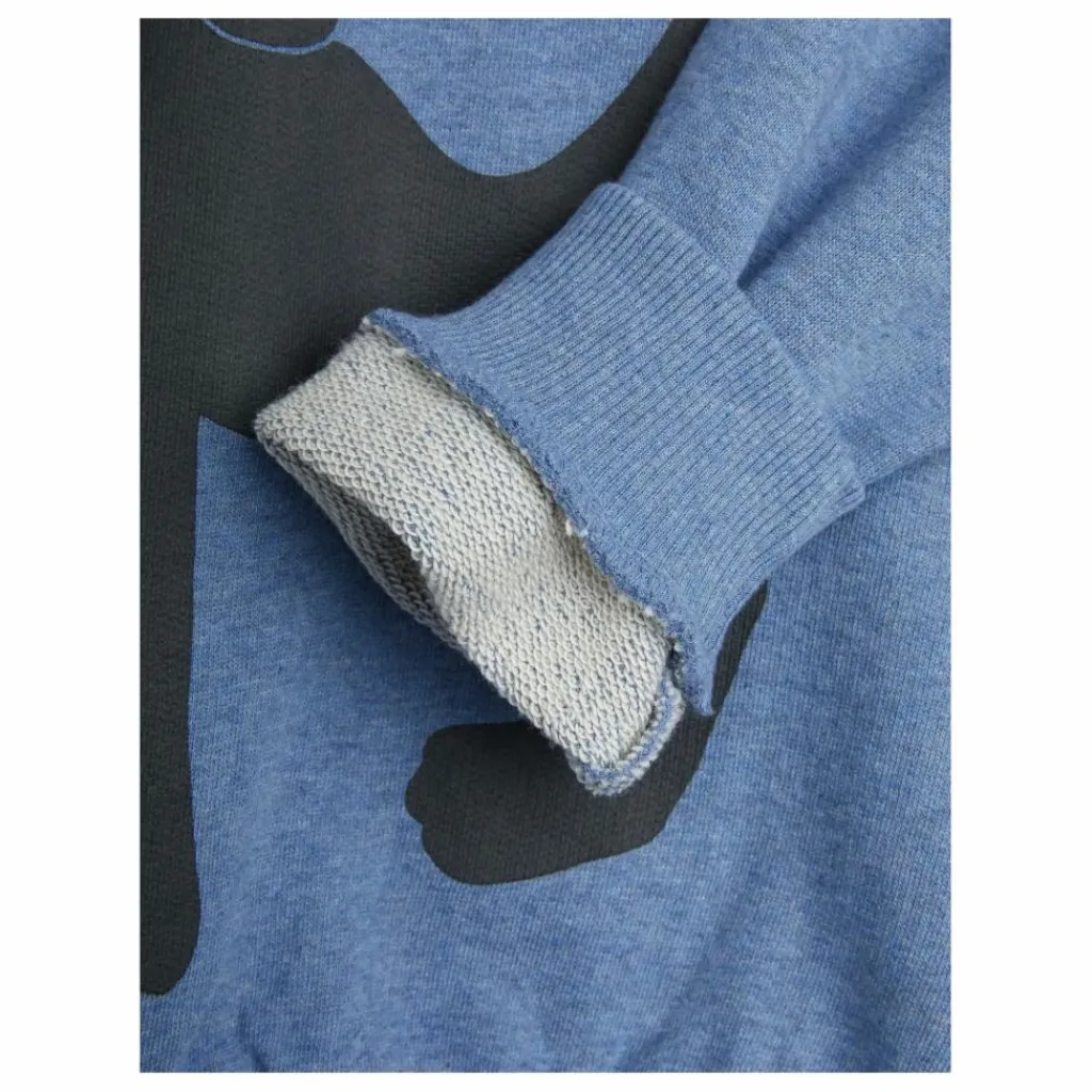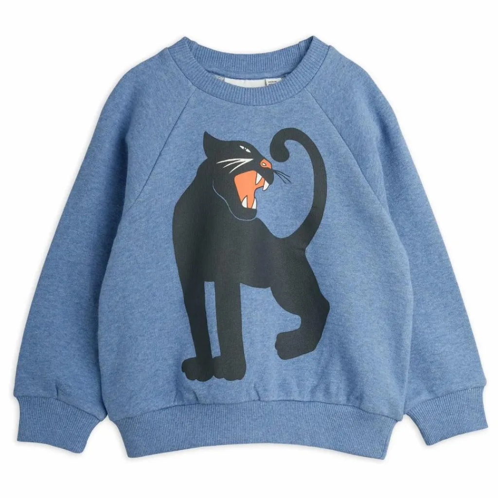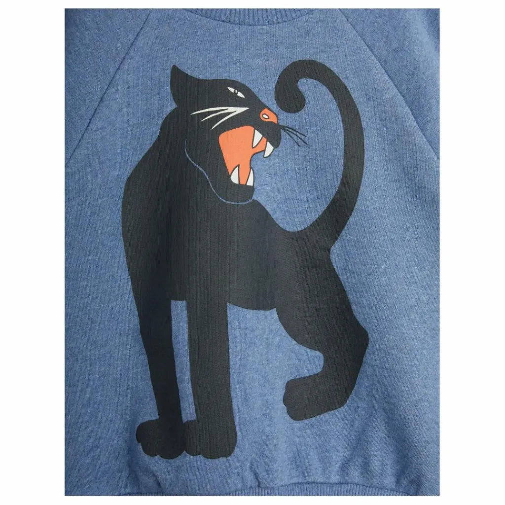 - Sweat-shirt bleu mélangé avec un grand imprimé Panthère sur le devant, en 100 % coton biologique certifié GOTS. Le sweat est conçu avec des manches raglan, des côtes au niveau du cou, des extrémités des manches et de l’ourlet inférieur.