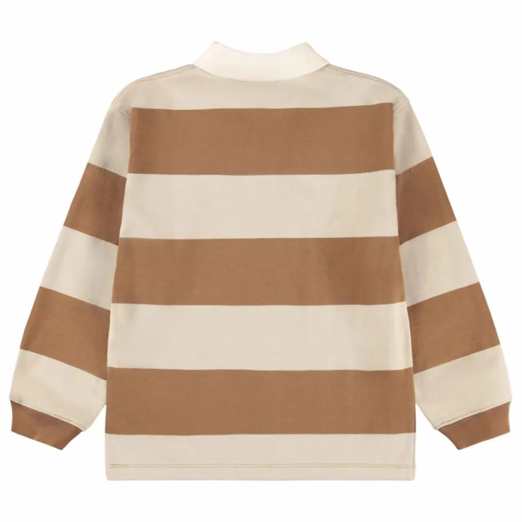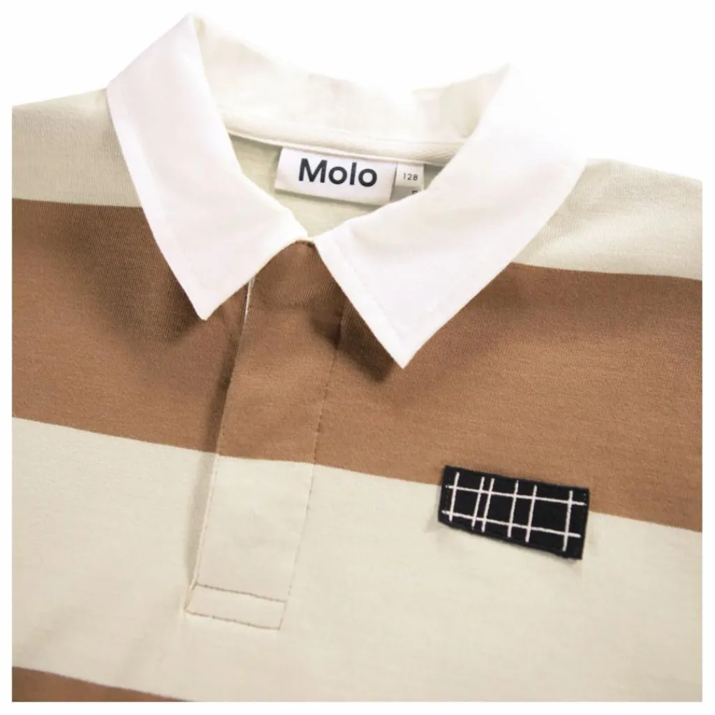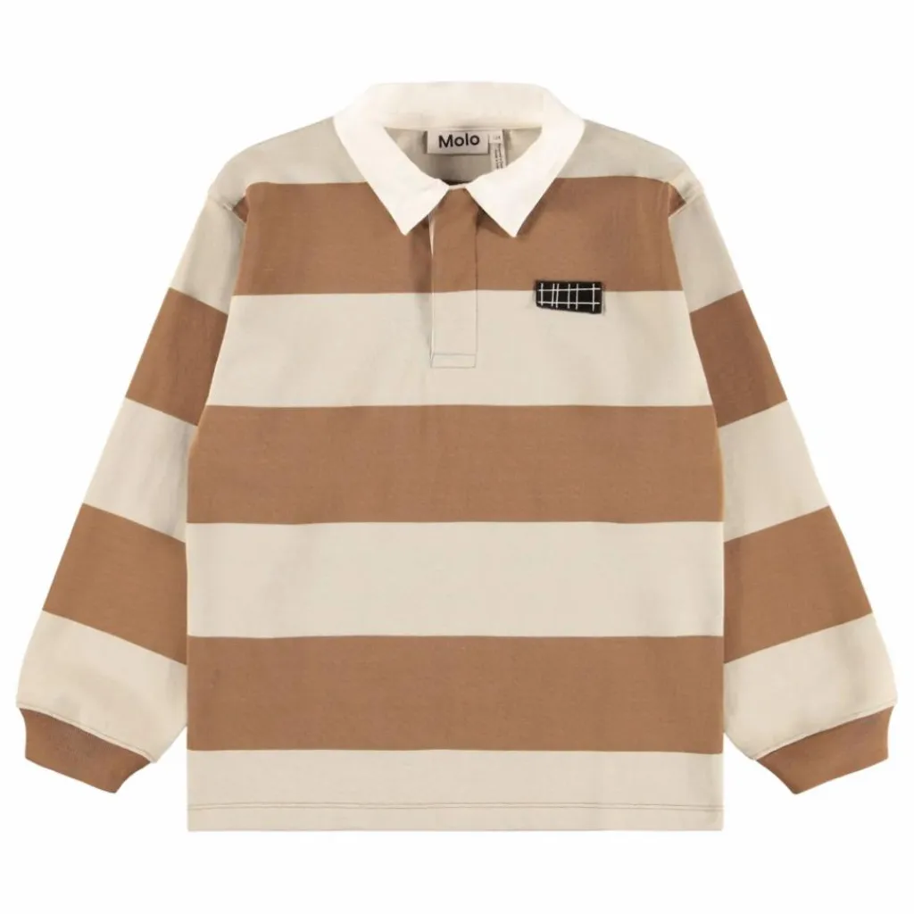 - Cette chemise de rugby à larges rayures marron et beige de Molo est fabriquée en coton biologique doux. Elle présente une coupe régulière, des manches longues avec poignets côtelés, un col chemise blanc et une petite patte de boutonnage avec trois boutons cachés, ce qui permet de l’enfiler facilement.
