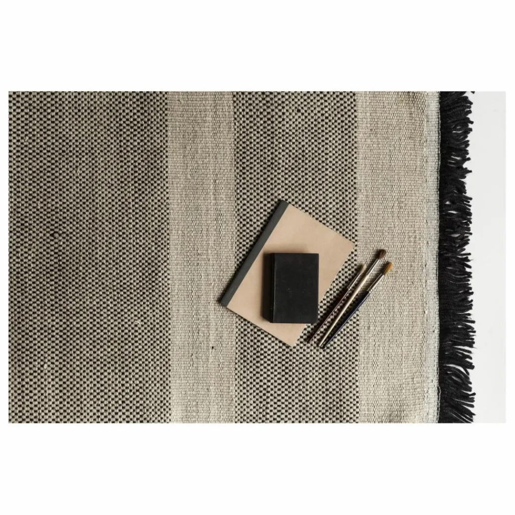 Tres est un tapis indien traditionnel à tissage plat Dhurrie. Sa qualité unique réside dans la production de trois pièces indépendantes dans lesquelles différentes fibres prédominent.La proportion et la combinaison de laine, de feutre et de coton génèrent des changements de ton et d’irrégularités dans le tissage, donnant vie au motif.
