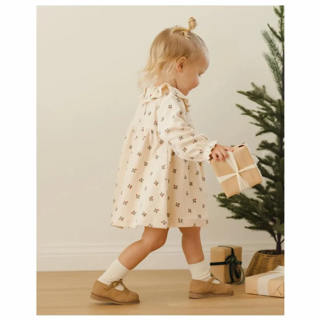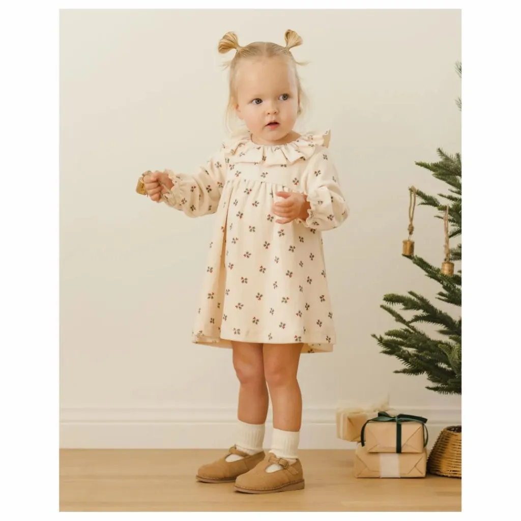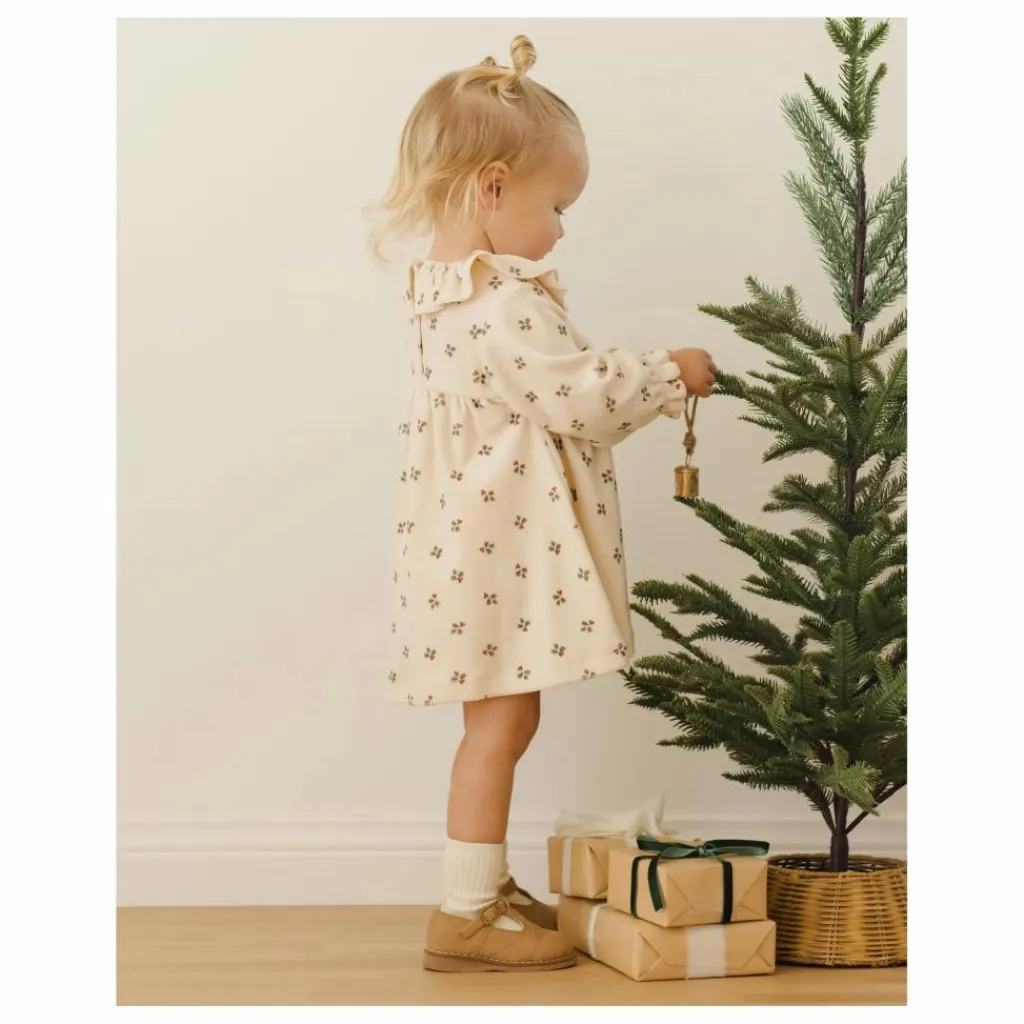 - Notre robe en velours pour bébé est une robe à taille empire avec des manches longues et un joli col à volants, dans notre coloris ‘holly berry’.
