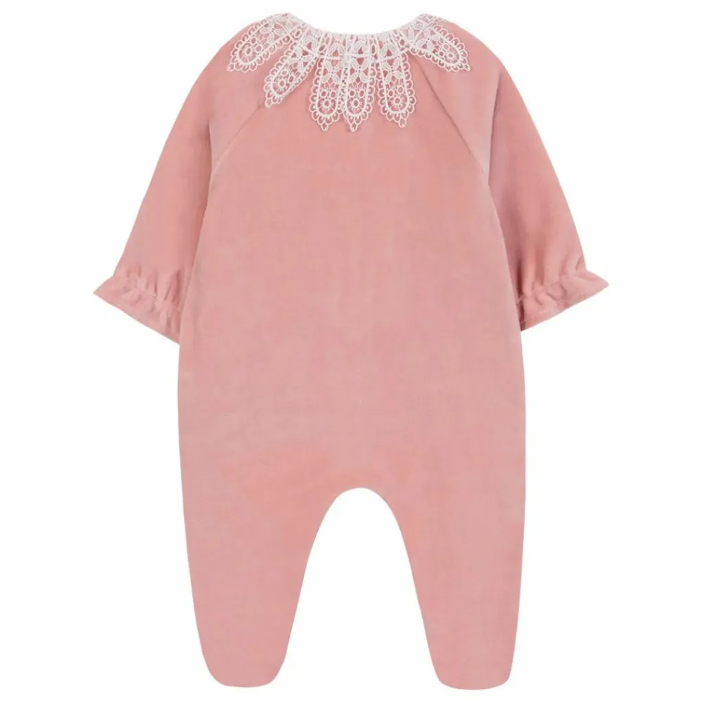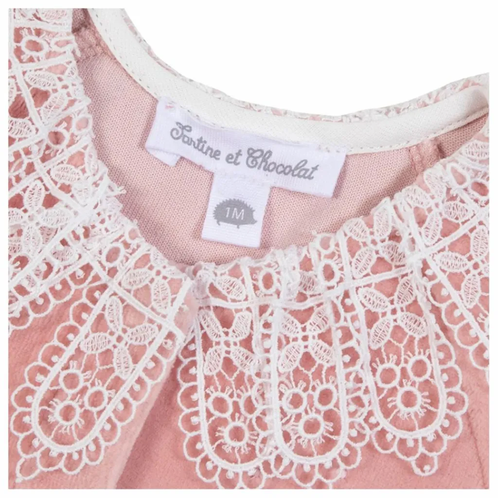 - Ce pyjama en velours pêche pour fille dévoile un col en dentelle délicat, pour une allure douce et élégante dès les premiers instants. Confortable et raffiné, il accompagne bébé avec tendresse tout au long de ses nuits.