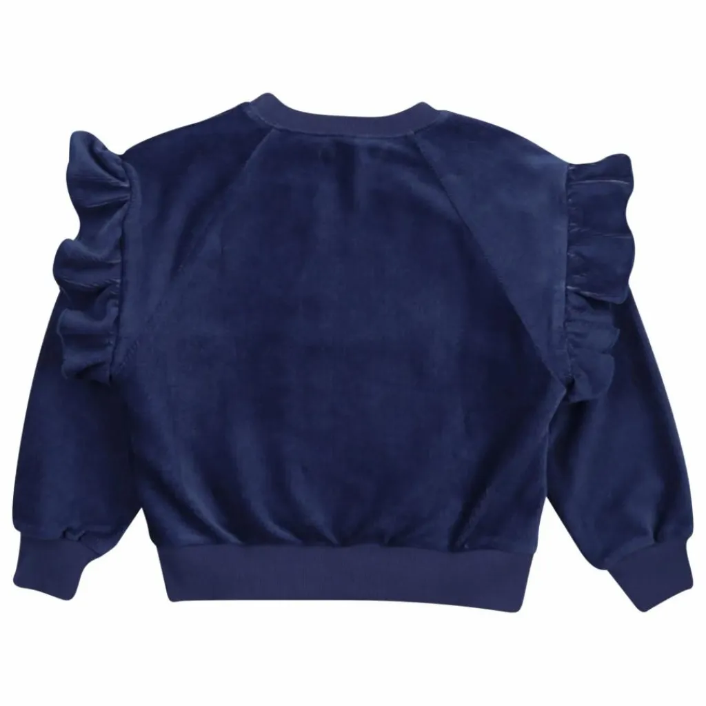 - Sweat en velours avec un détail unique de volants sur les épaules et une broderie de la marque sur la poitrine. Il est accompagné d’un pantalon assorti pour compléter le look.