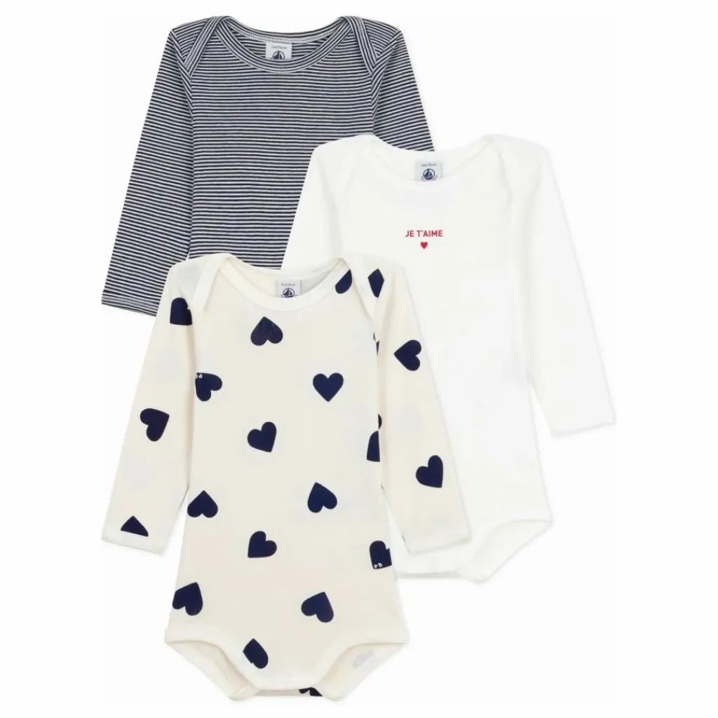 - Pratique grâce à l’encolure américaine et aux boutons-pression à l’entrejambe. Ce lot comprend un body imprimé cœur, un body uni et un body milleraies.