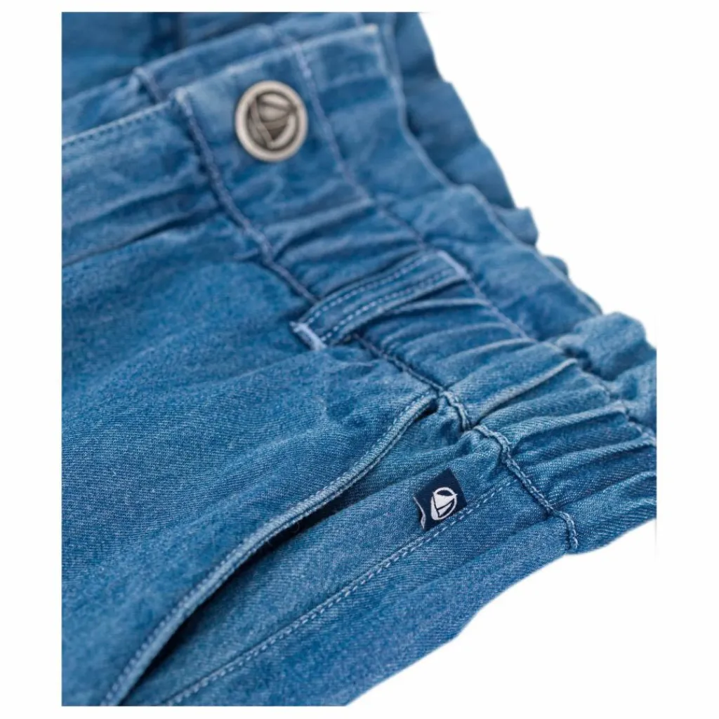 - Pantalon fille en denim léger, une matière agréable et souple. Coupe carotte. Taille froncée et élastiquée, ouverture par bouton pression et braguette zippée. Poches latérales.