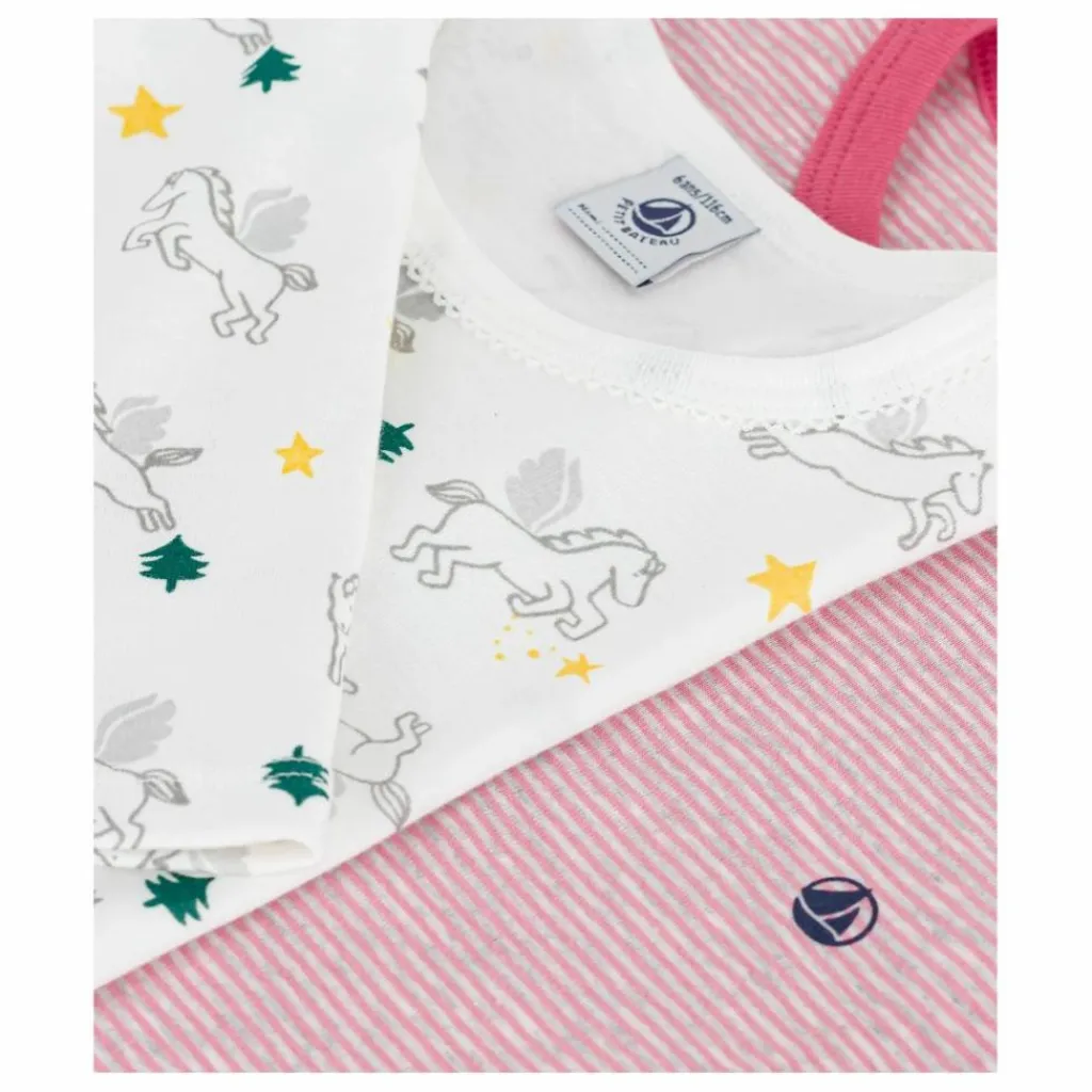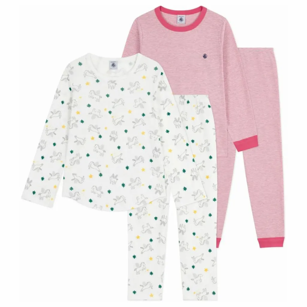 - Le premier pyjama est en côte 1×1 à imprimé féérique. Le second pyjama est en côte 1×1 rayures milleraies.