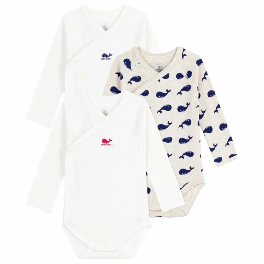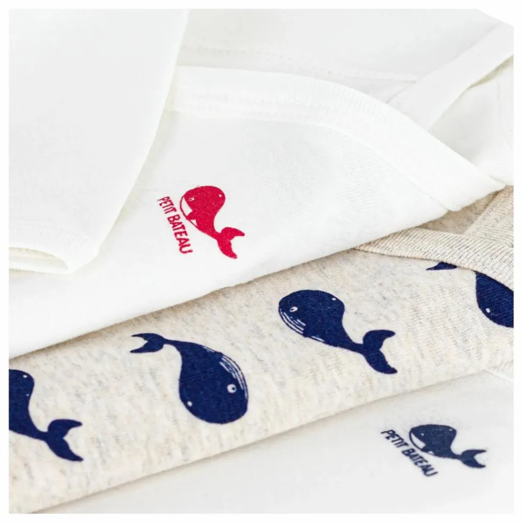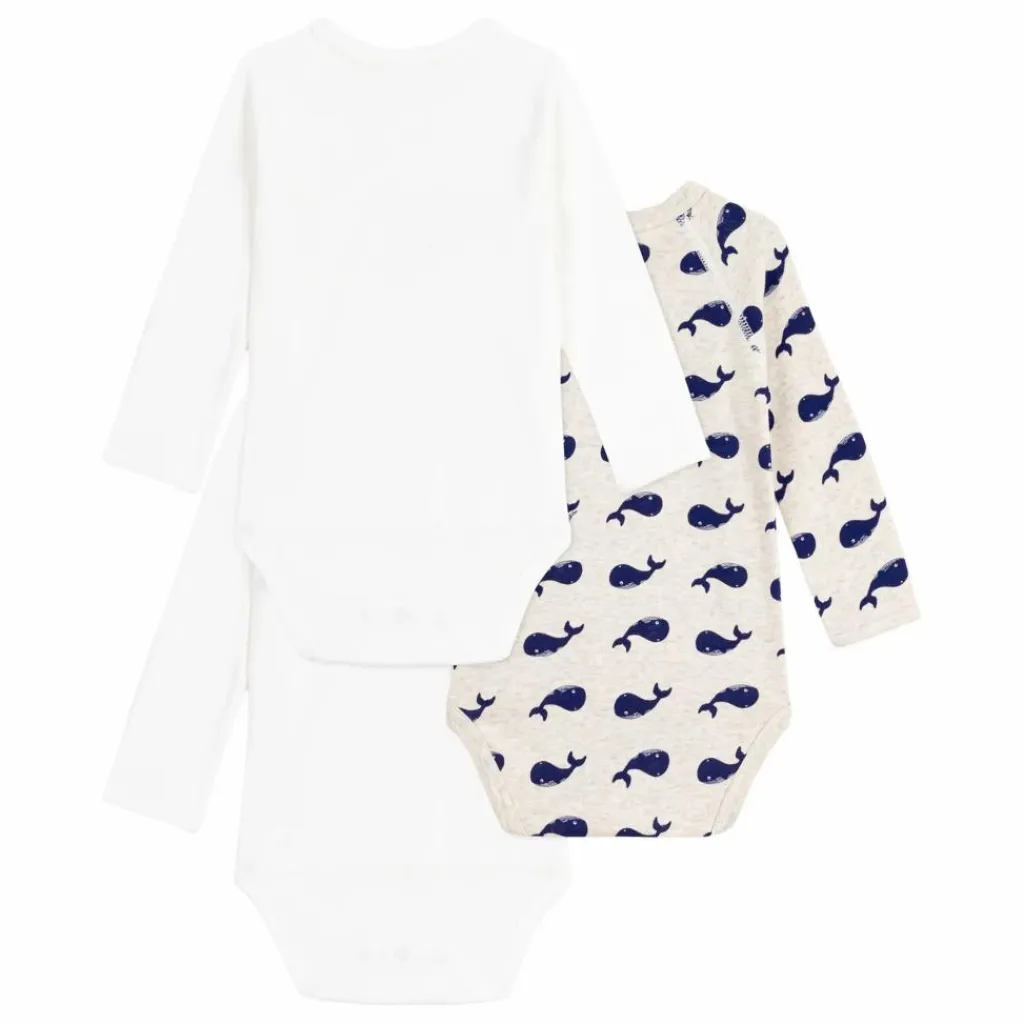 - Ce lot comprend un body imprimé baleine et deux bodies unis avec sérigraphie. L’ouverture se fait par boutons-pression sur le devant et à l’entrejambe.