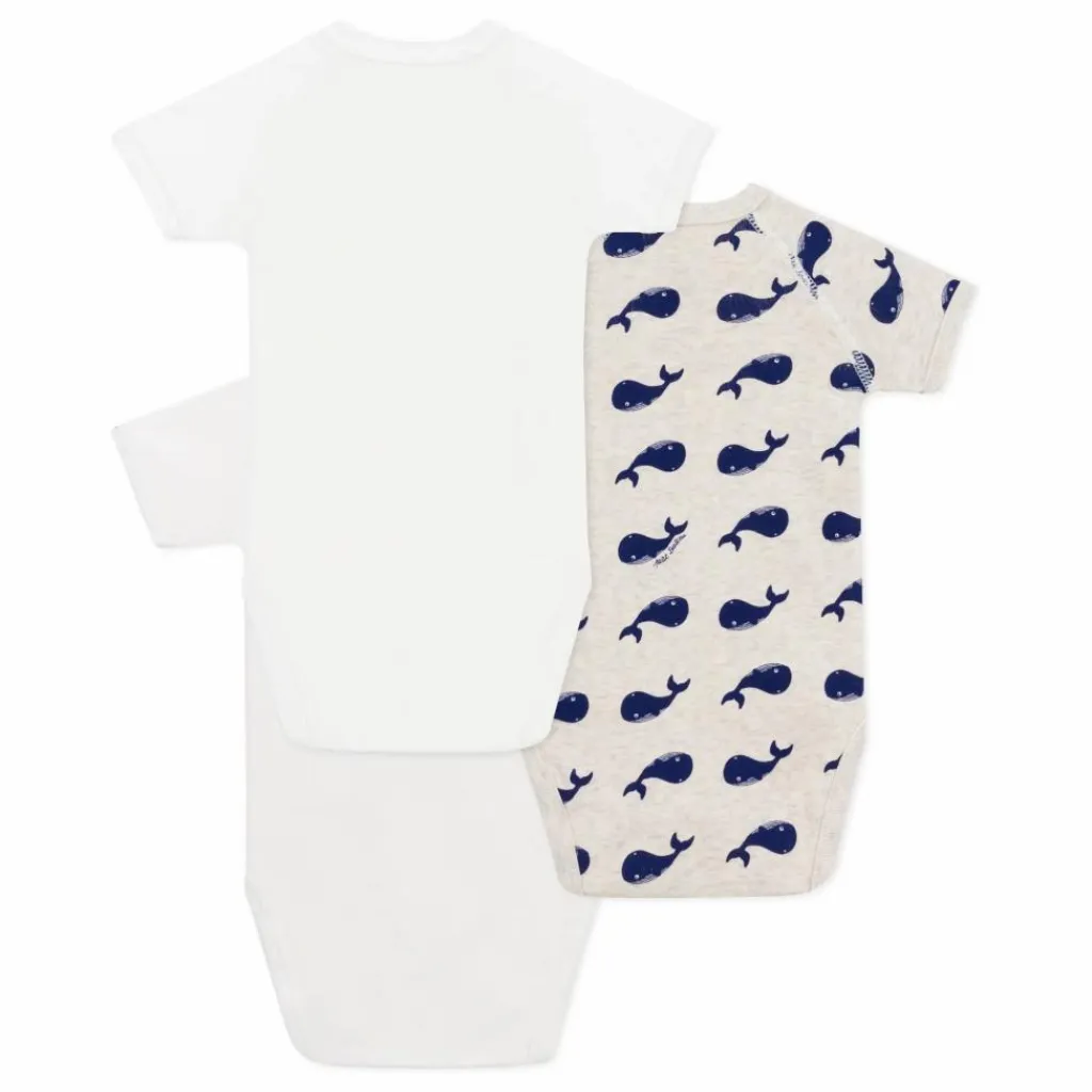 - Lot de 3 bodies unisexes à manches courtes en tricot côtelé 1X1, un tissu confortable et extensible.Les bodies enveloppants sont parfaits pour les nouveau-nés car leur large ouverture vous évite d’avoir à entrer et sortir votre bébé pour le changer.Ils se ferment avec des boutons-pression sur le devant et entre les jambes.Ce lot comprend un body à imprimé baleine et deux autres unis.