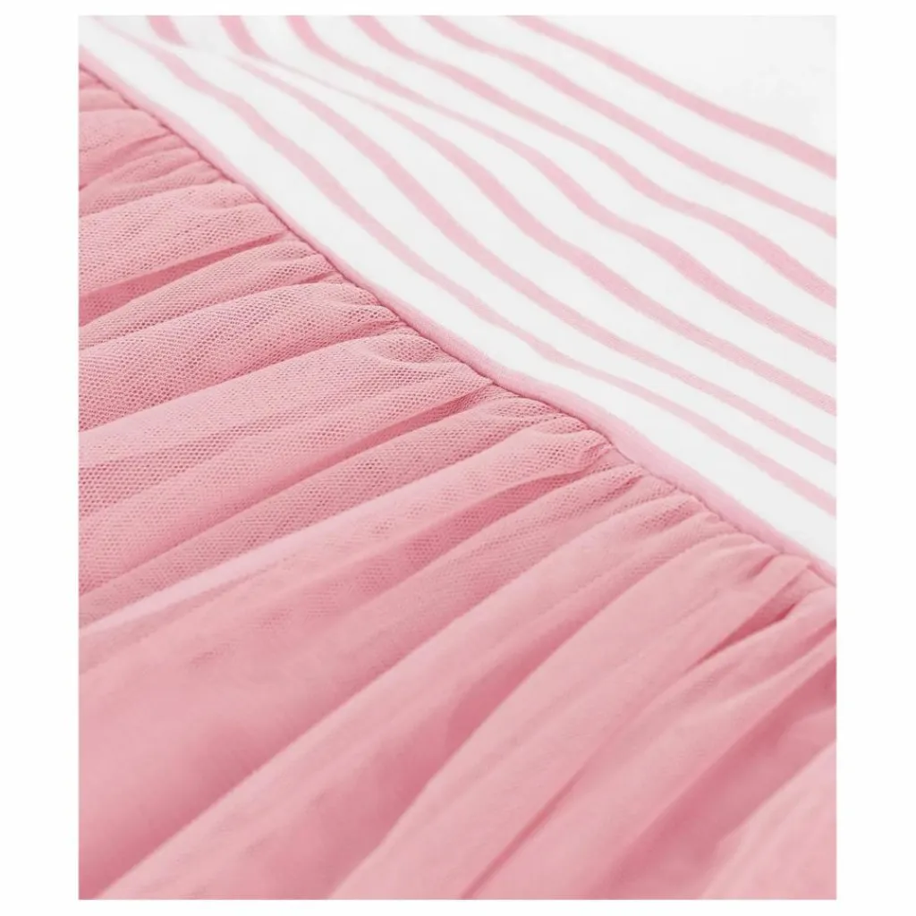 - Robe pour fille composée de deux matières : du jersey léger rayé pour le haut et du tulle uni pour la jupe.Trop mignonne avec sa jupe en tulle!La fermeture boutonnée dans le dos facilite grandement l’habillage.C’est une affaire de famille : ces modèles existent aussi pour les enfants!Longueur au genou.