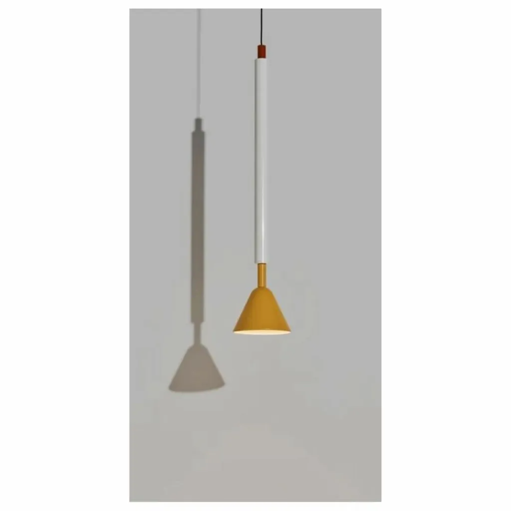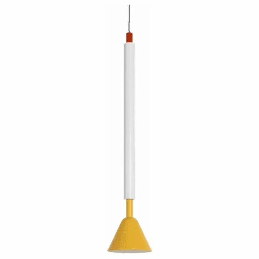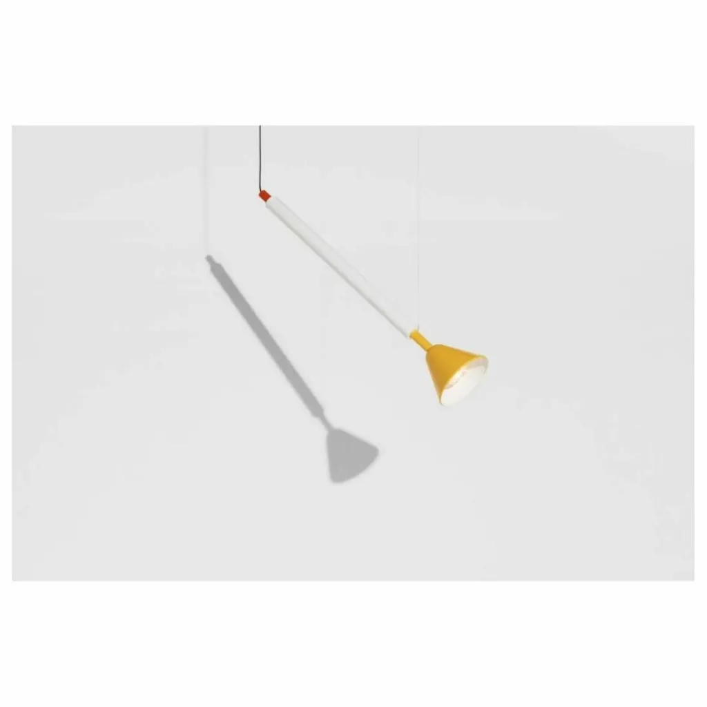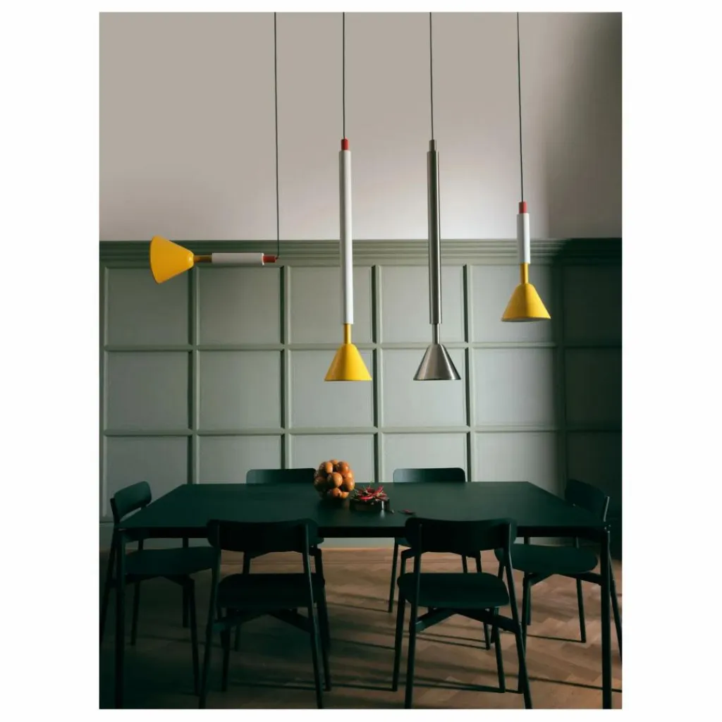 - La grande suspension PYL fait partie d’une collection de luminaire fabriquée à 100% de tubes d’acier polis et peints, associés à des cônes qui signent la collection, et se décline dans deux formats et deux coloris. Le détail de PYL est le verre moulé et pressé qui vient diffuser la lumière et jouer avec le motif, dessiné par Marie & Alexandre. La gamme de couleurs puise ses sources dans le design italien du siècle dernier avec un jaune vif et un rouge piment, associés à de l’acier brut façon Renzo Piano. En résulte une narration chorégraphique à plusieurs typologies : formes, matières et couleurs.