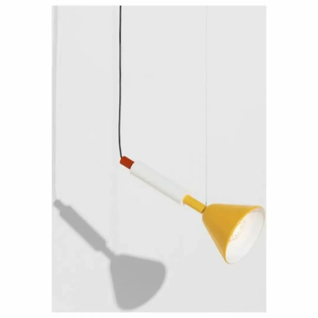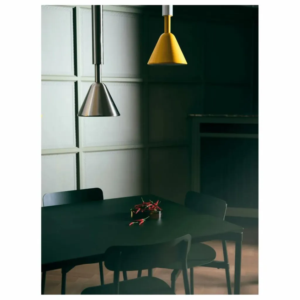 - La petite suspension PYL fait partie d’une collection de luminaire fabriquée à 100% de tubes d’acier polis et peints, associés à des cônes qui signent la collection, et se décline dans deux formats et deux coloris. Le détail de PYL est le verre moulé et pressé qui vient diffuser la lumière et jouer avec le motif, dessiné par Marie & Alexandre. La gamme de couleurs puise ses sources dans le design italien du siècle dernier avec un jaune vif et un rouge piment, associés à de l’acier brut façon Renzo Piano. En résulte une narration chorégraphique à plusieurs typologies : formes, matières et couleurs.