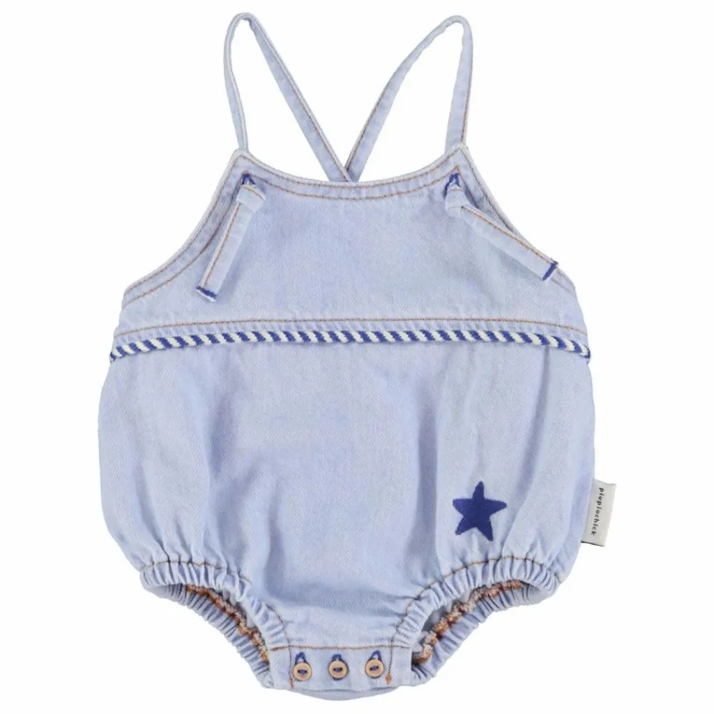 - Barboteuse pour bébé en denim doux avec fines bretelles réglables. Décorée d’un passepoil et d’une étoile bleue brodée. Boutons en bois à fermeture facile à l’entrejambe.