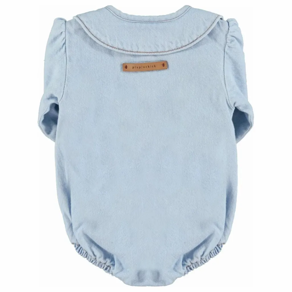 - Barboteuse à manches longues pour bébé avec col à volants. Boutons sur le devant. Poignets élastiqués. Côtes élastiques aux cuisses. Fermetures entre les jambes. Logo en cuir au dos.