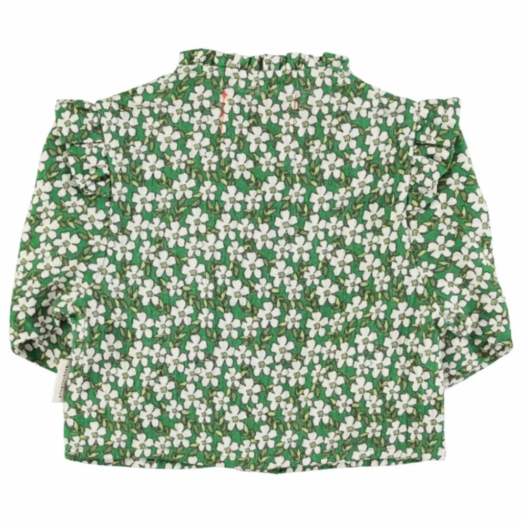 - Chemisier à col rond orné d’un petit volant. Froufrous sur les épaules. Poignet élastiqué. Boutons noirs sur le devant.