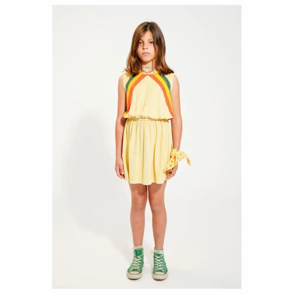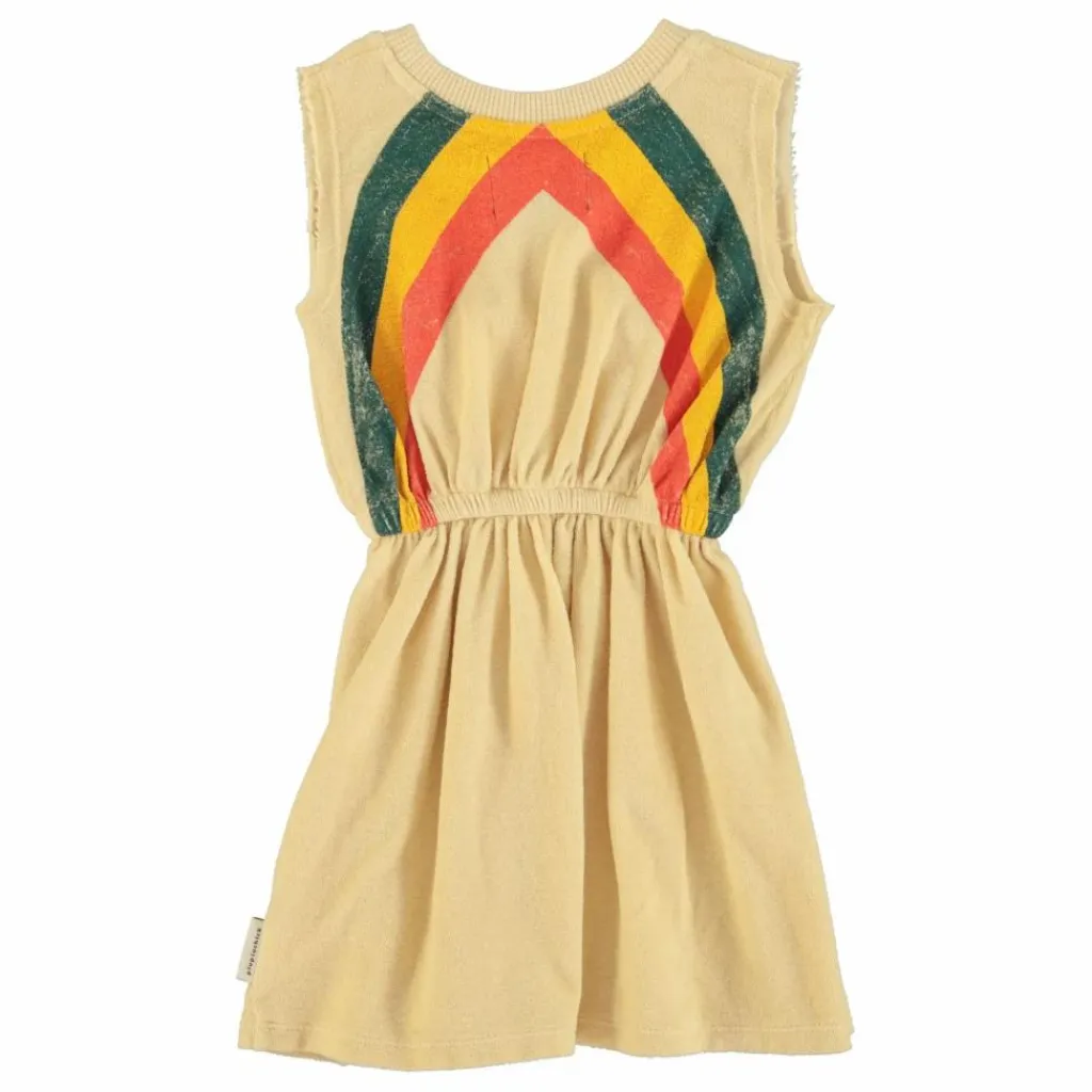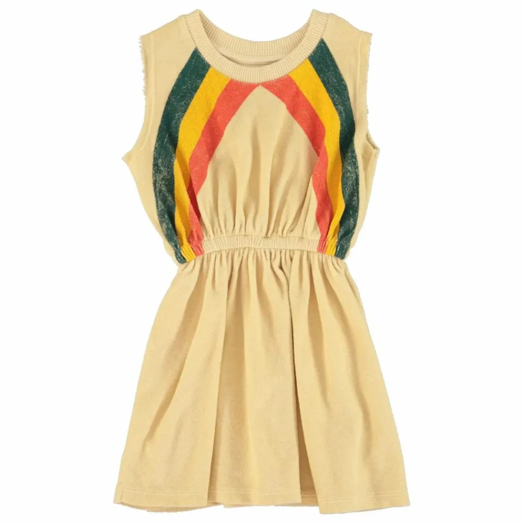 - Robe courte en coton éponge biologique avec encolure ronde et taille élastiquée pour une coupe fluide et plissée. Emmanchures larges à bord brut. Imprimée de rayures multicolores sur le devant et le dos.