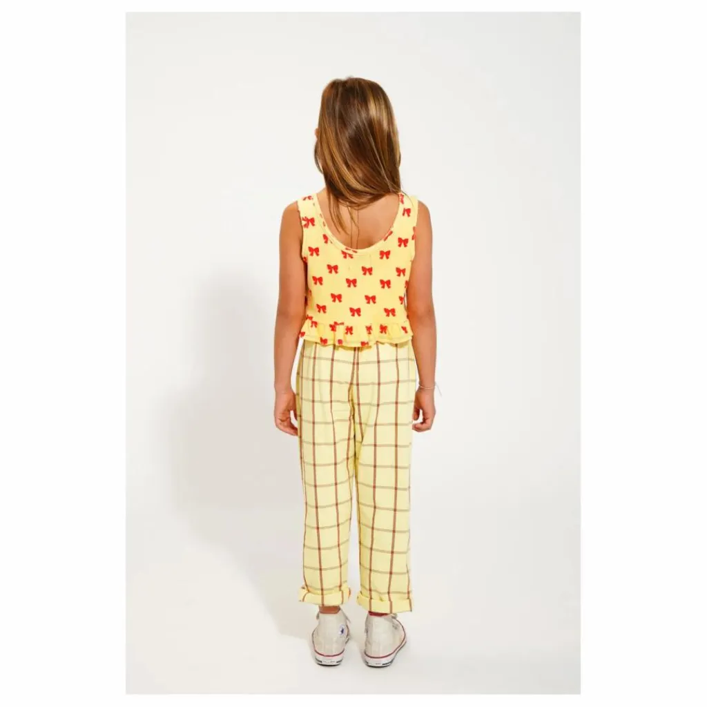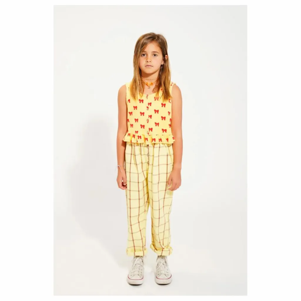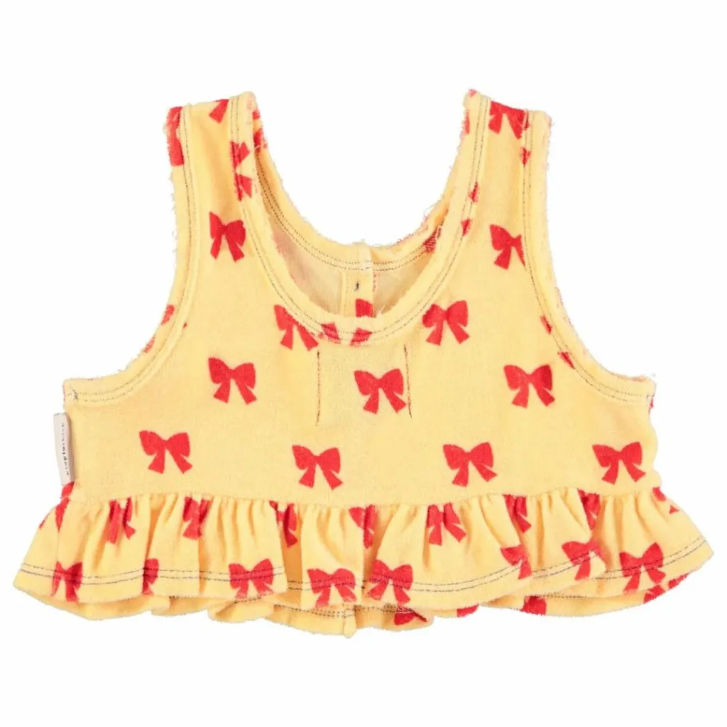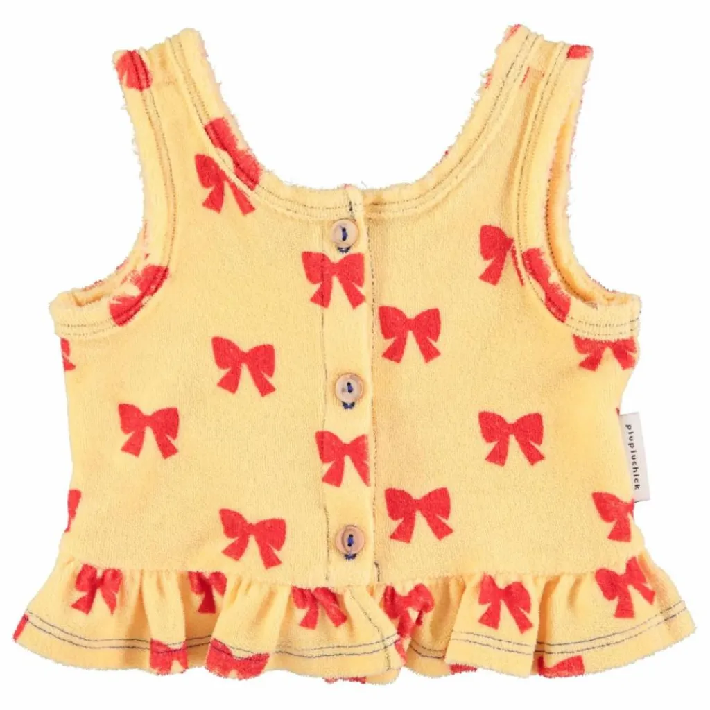- Top en coton éponge bio avec froufrous autour de la taille. Ouverture par boutons en bois sur le devant. Détaillé avec des nœuds rouges sur tout le corps.