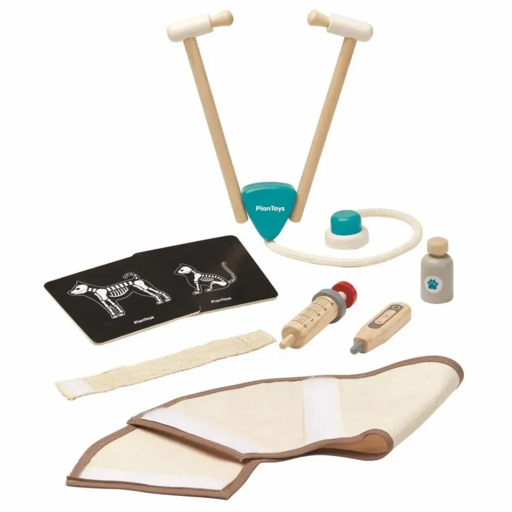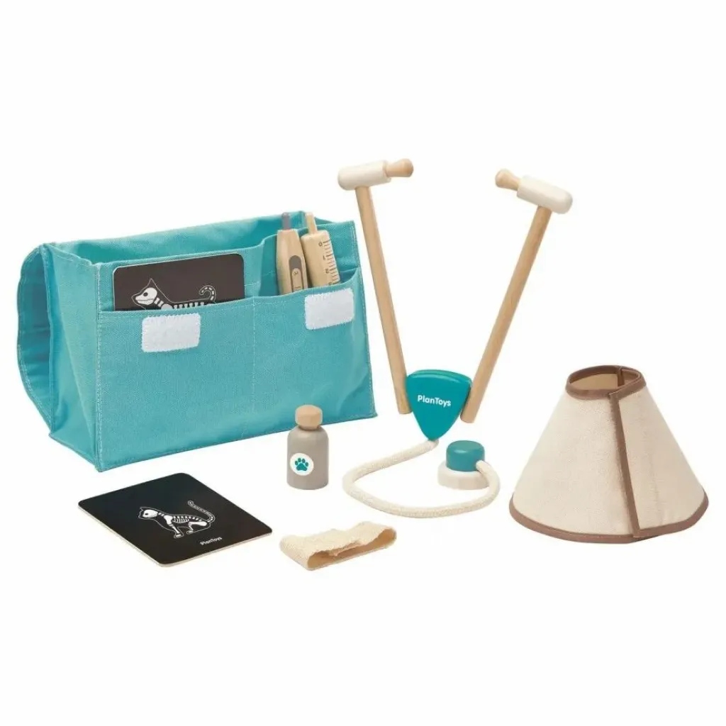 Apprendre à soigner les animaux avec cetensemble vétérinaire de 8 pièces. Il se compose des équipements médicaux de base: un vaccin, unbandage, une collerette, un thermomètre, une seringue, un stéthoscope, 2 radiographies etune valise pratique pour transporter le tout, tel un vrai vétérinaire.