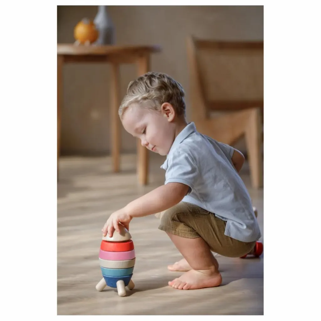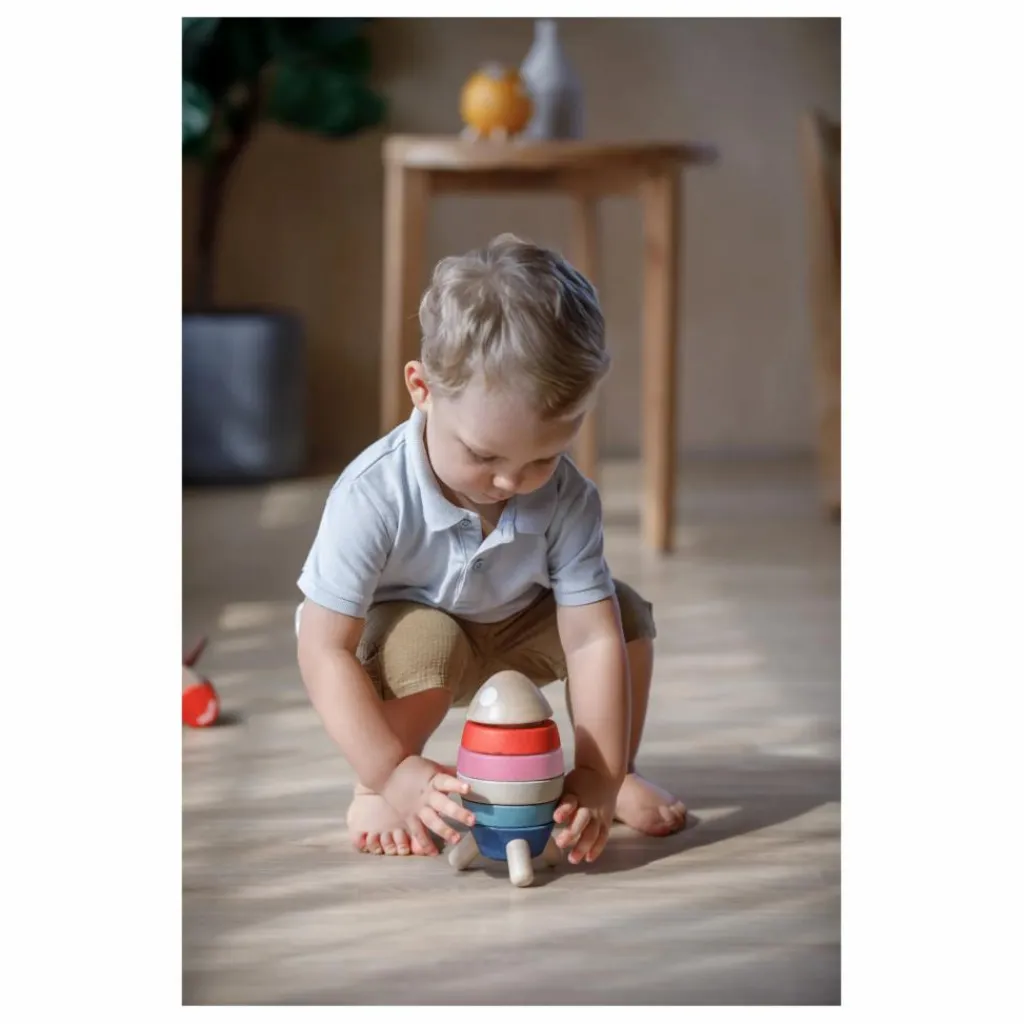 Cette fusée se construit en empilant et en faisant correspondre toutes les pièces colorées. Placez l’astronaute sur le siège et lancez le compte à rebours 3..2..1, décollez !