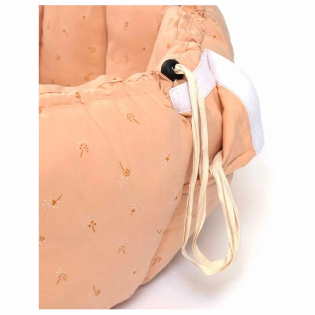 - Pour passer du tapis de jeu au lit de bébé/rangement, soulevez les pétales en tirant doucement sur les ficelles. Insérez toujours la ficelle en coton et le bloqueur de ficelle dans la pochette et fermez-la bien.