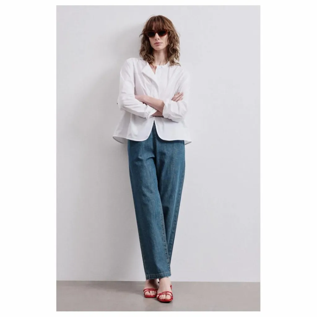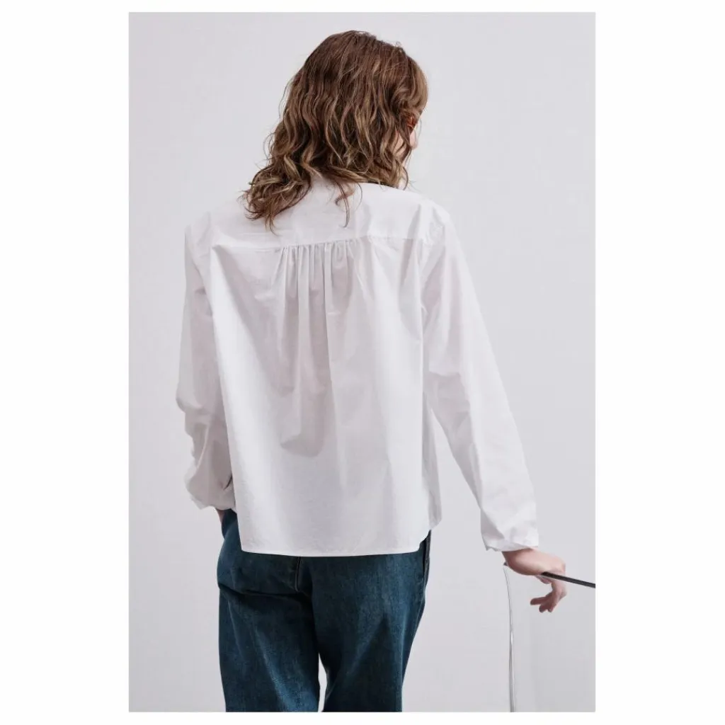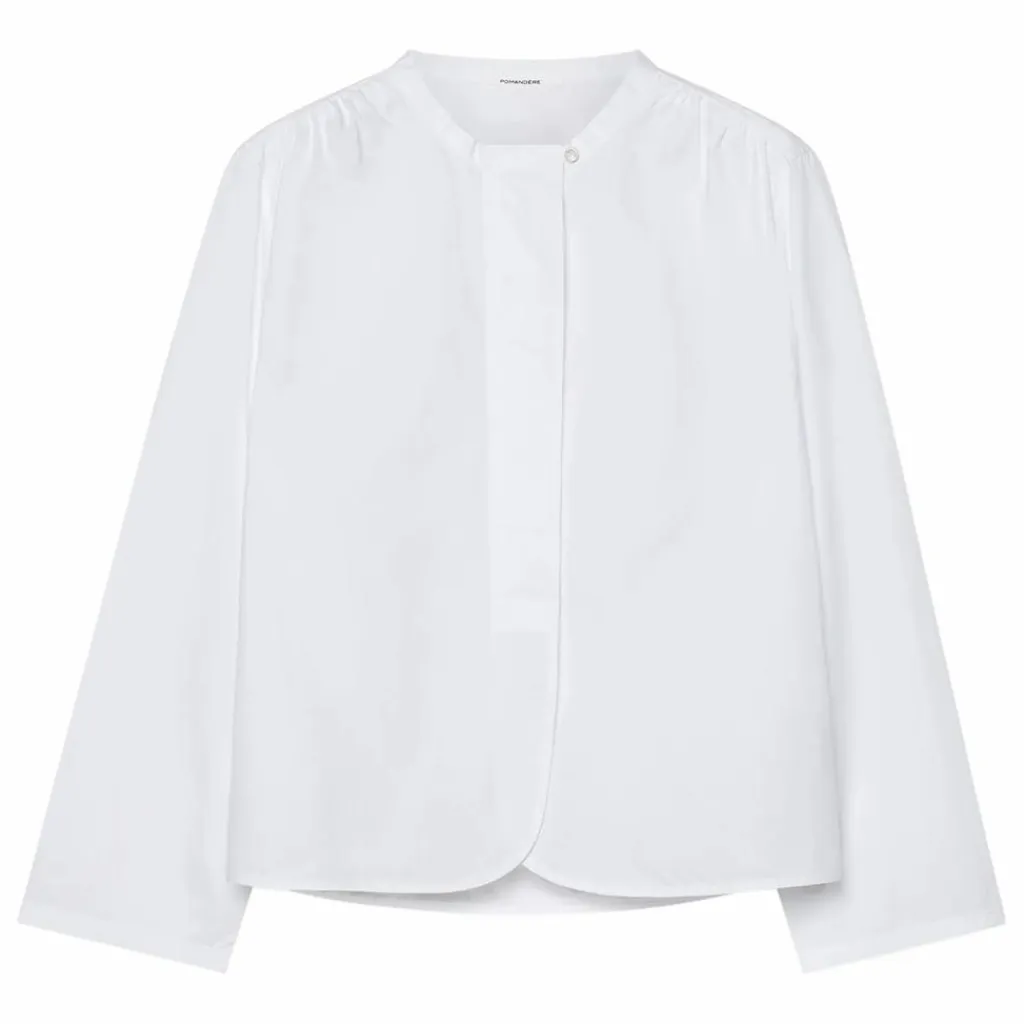- Des détails plissés, un ourlet arrondi et une esthétique raffinée définissent le charme féminin de la chemise en popeline de coton, un tissu quatre saisons à la texture légère et extrêmement agréable à porter.