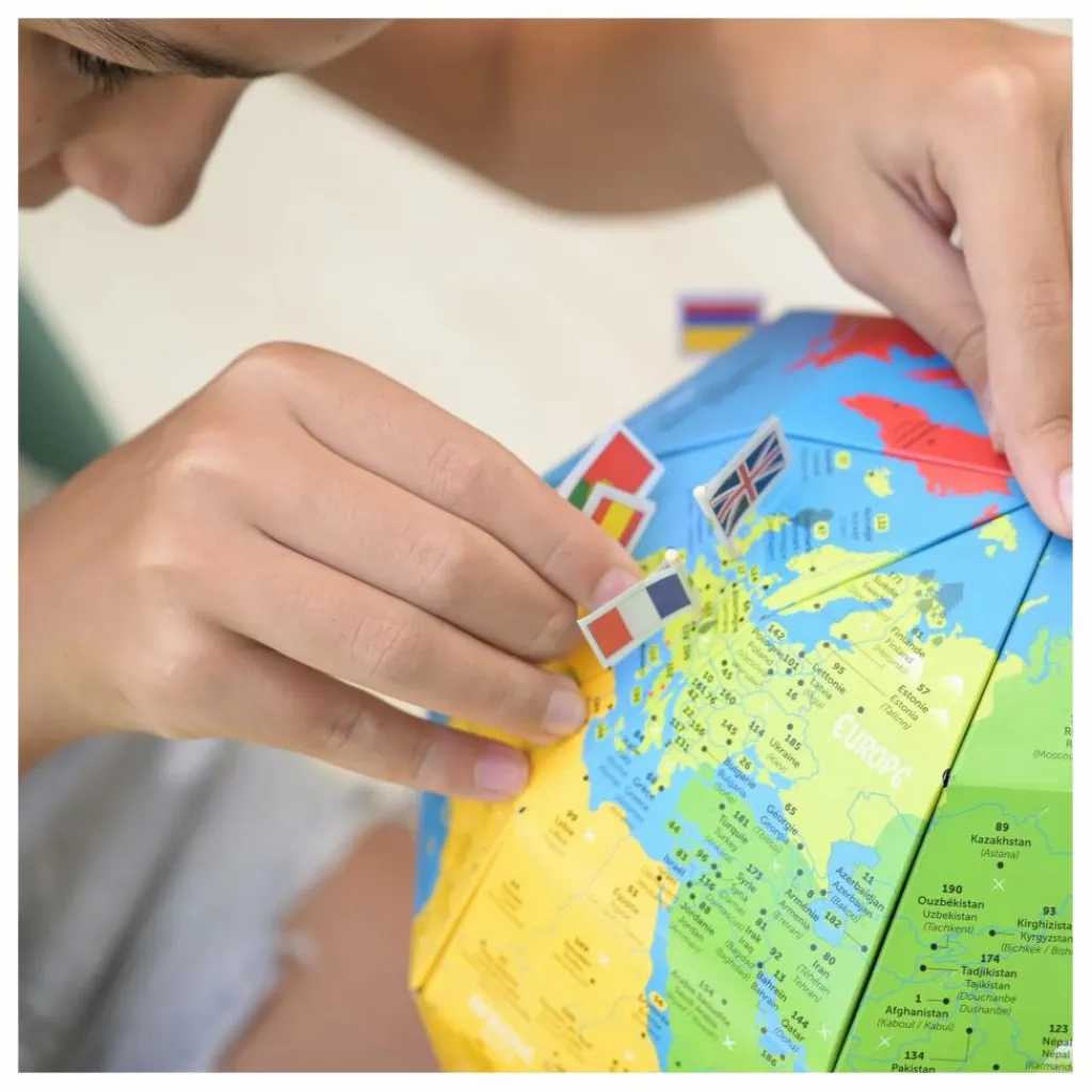 Fabriquer soi-même son premier globe terrestre sans colle ni ciseau : voilà une activité fascinante qui conduira les enfants à découvrir la Terre en volume. Encore mieux : plantez les drapeaux des grands pays de chaque continents !