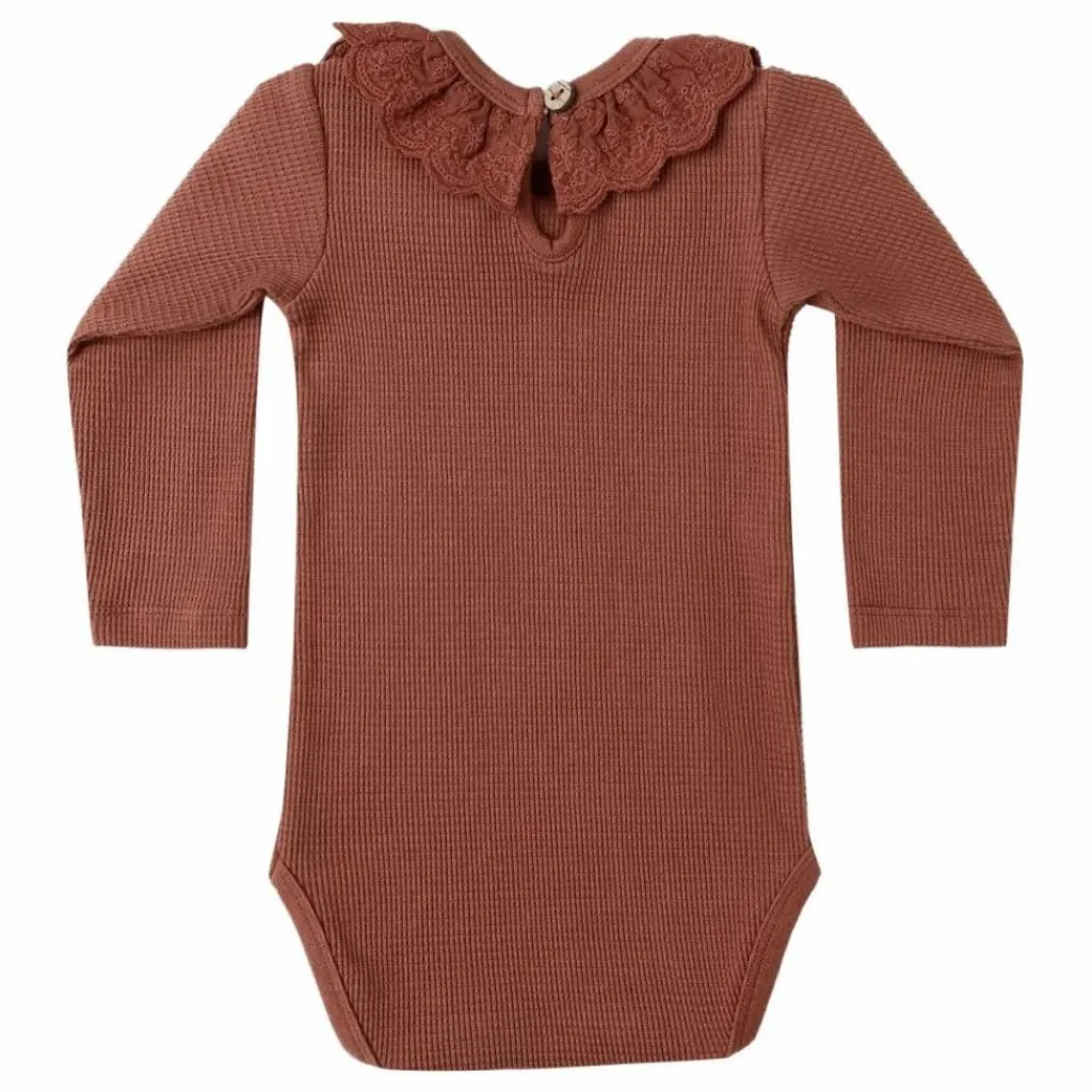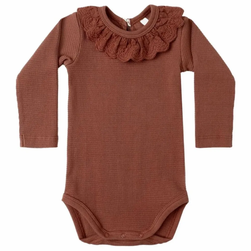 - Combinaison à manches longues, avec un joli col à volants. Toutes les tailles ont des boutons-pression à l’entrejambe pour faciliter le changement de vêtements ;
